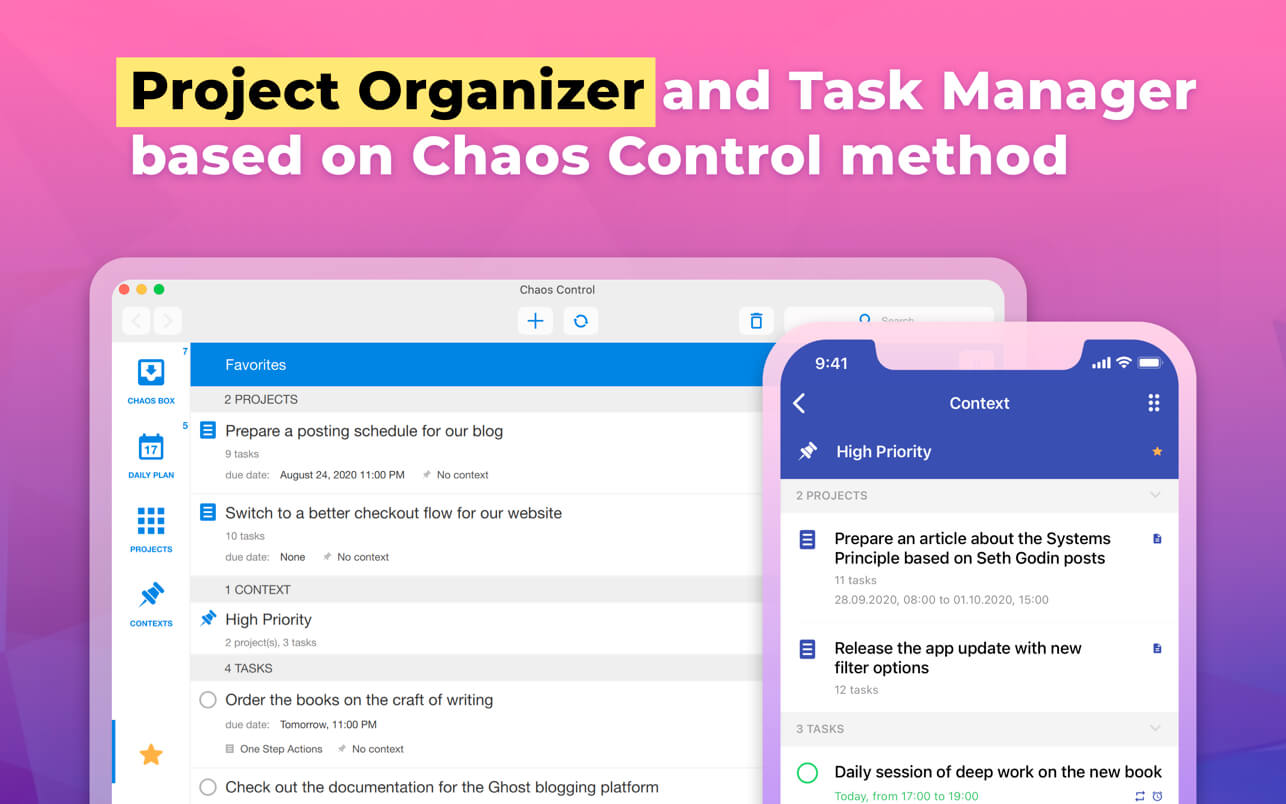 Chaos Control is a task manager based on the best ideas of GTD (Getting Things Done) methodology created by David Allen. Whether you are running a business, launching an app, working on a project or simply planning your holiday trip, Chaos Control is a perfect tool to manage your goals, juggle your priorities, and organize your tasks to get things done. And the best part is, you can handle both heavyweight project planning and simple daily routine like shopping list management in one flexible app. Also, Chaos Control is available across all major mobile and desktop platforms with seamless sync.