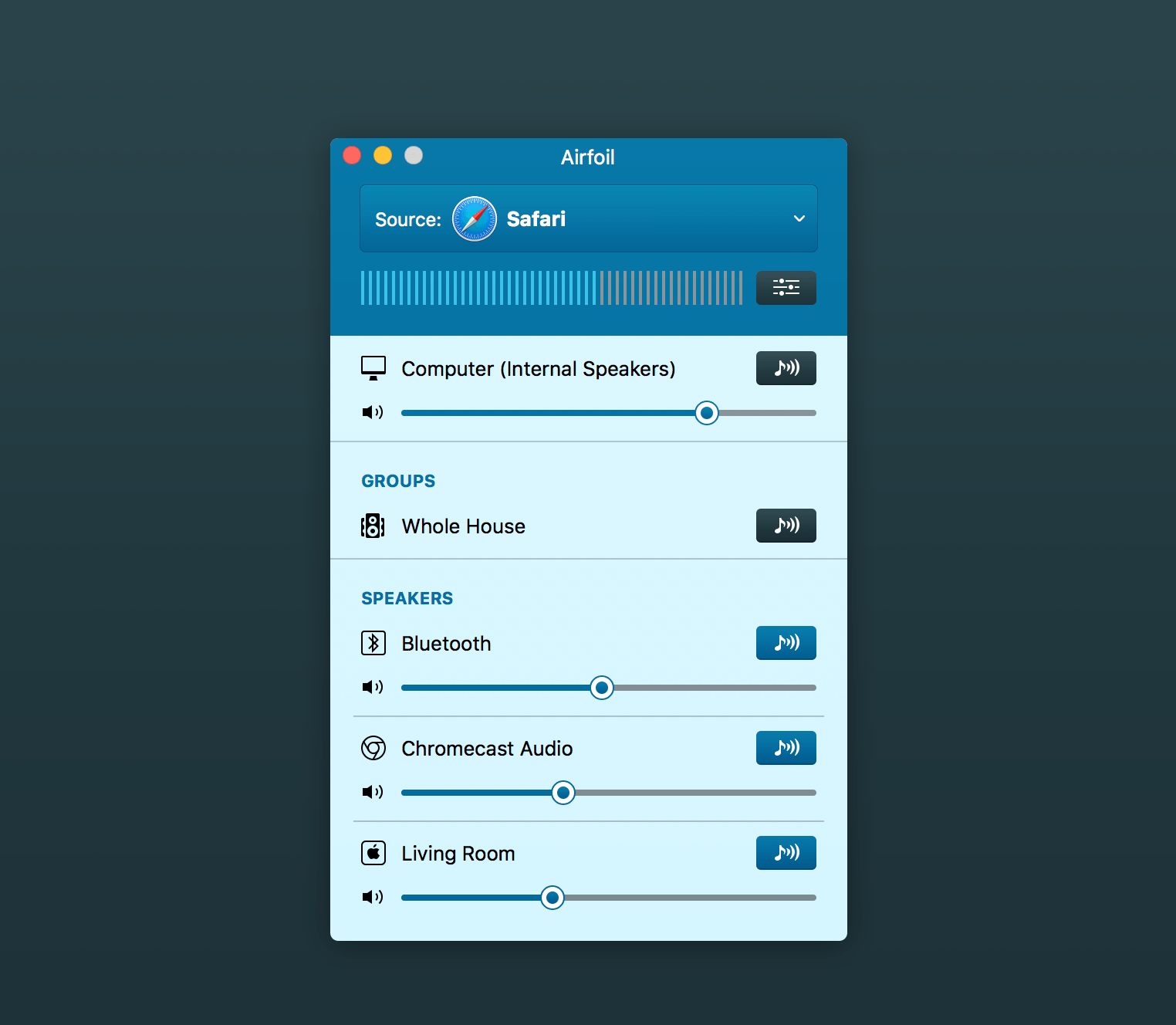 Airfoil allows you to send any audio to AirPort Express units, Apple TVs, and even other Macs and PCs, all in sync! It’s your audio – everywhere.
