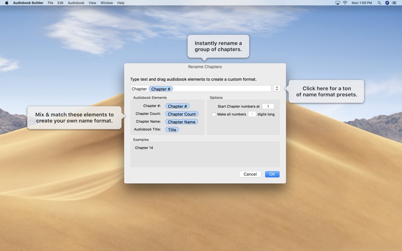 Audiobook Builder makes it easy to turn your audio CDs and files into audiobooks for your iPhone, iPod or iPad. Join audio, create enhanced chapter stops, adjust quality settings, and let Audiobook Builder handle the rest. When it finishes you get one or a few audiobook tracks in iTunes instead of hundreds or even thousands of music tracks!