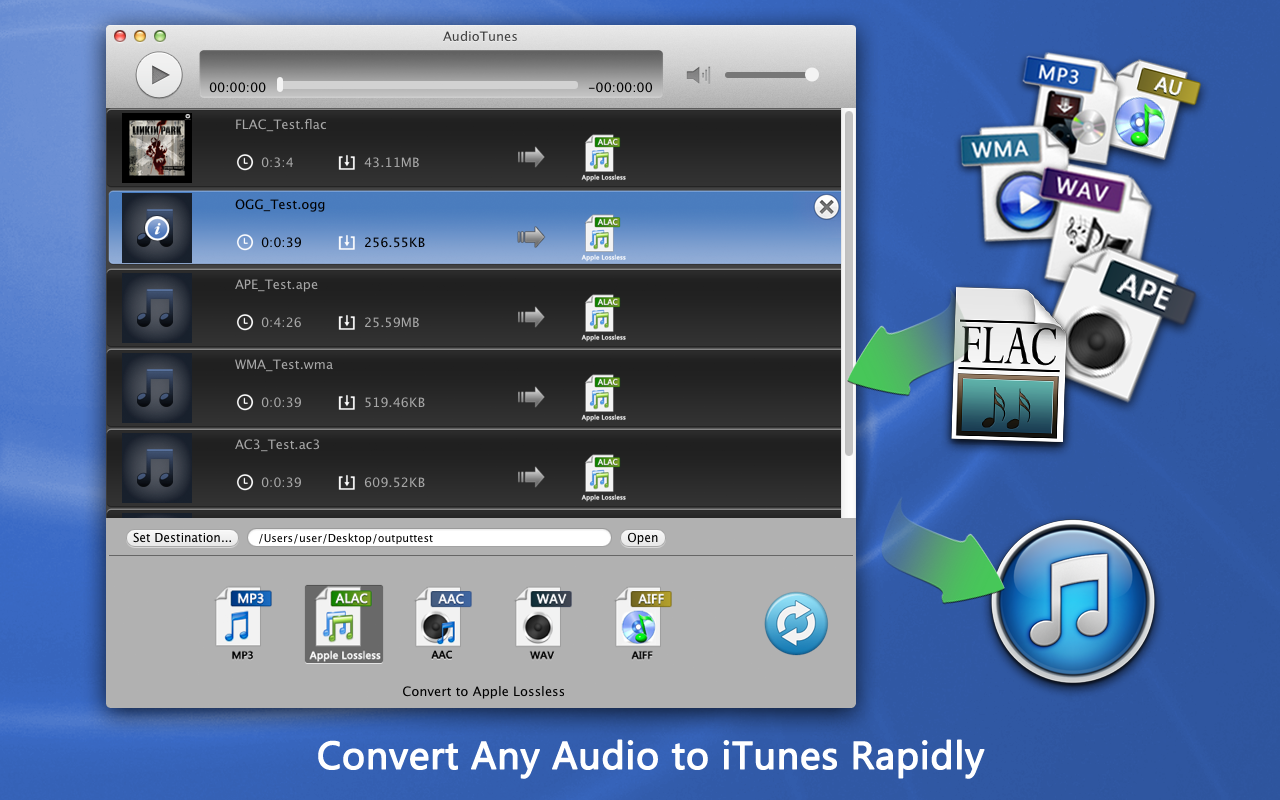 AudioTunes is a powerful audio converter that converts common audios (MP3,wav,flac,ape,wma,amr,ac3,au etc) to iTunes simply by 3 clicks. You can play those audios on your Mac or download them to the iOS devices.
