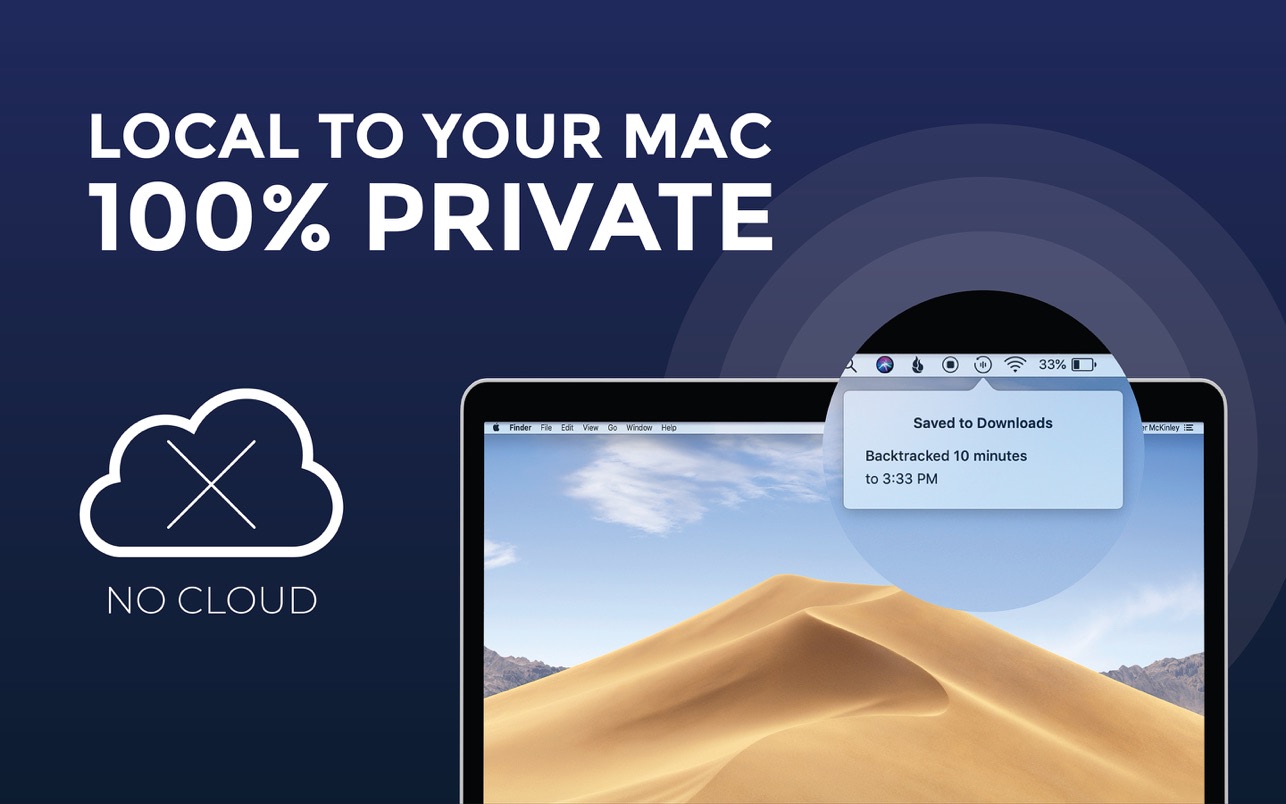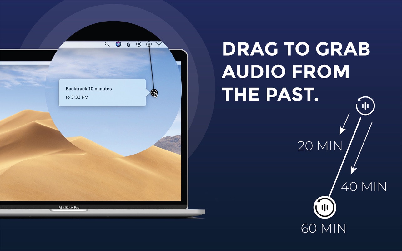 Backtrack is always recording, and over-writes a 60 minute window of audio over and over throughout the day, locally on your Mac. As soon as something happens that you realize you should have recorded, just drag the icon down to the time you need to backtrack to, and the app will save an audio file to your desktop.