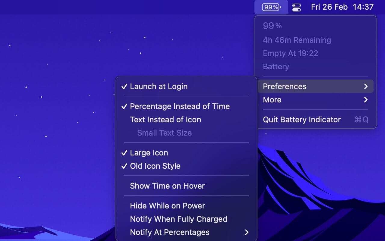 Shows the remaining battery time and percentage in the menu bar.