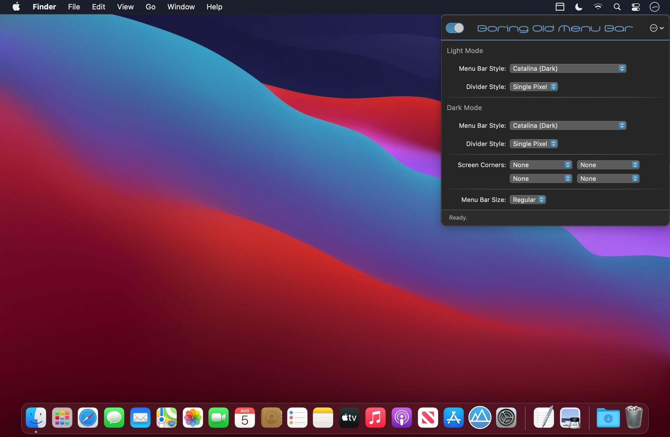 macOS 11 Big Sur does many things right and after a bit of getting used to, the visual style really grows on you. The transparent menu bar, however, is a bit of a legibility nightmare and something I could not live with. So I developed Boring Old Menu Bar to bring the “perfectly fine” macOS Catalina menu bar to macOS 11 Big Sur.