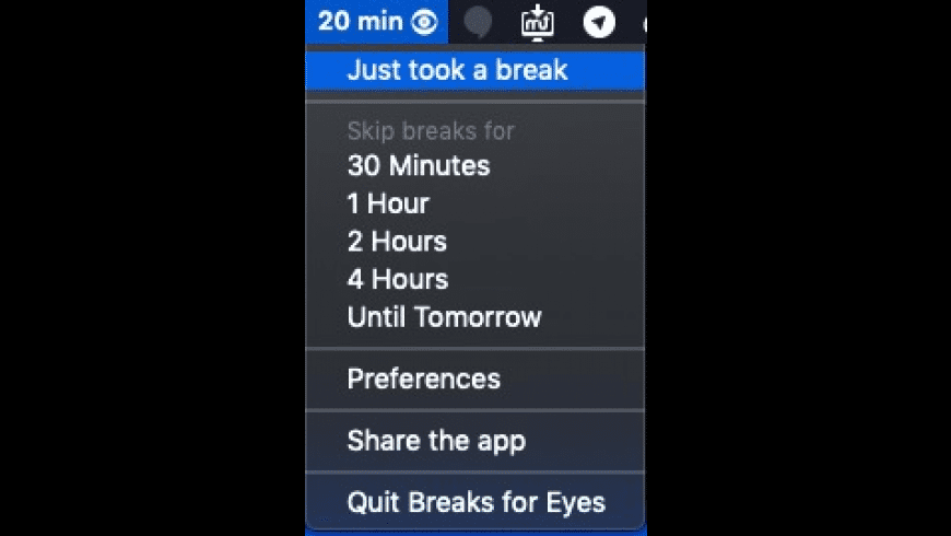 Breaks for Eyes is a Mac app that reminds you to take short breaks every 20 minutes. It’s a proven way to avoid eye strain & computer vision syndrome (CVS)