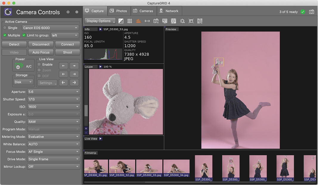 CaptureGRID is a digital photography work flow application for tethered shooting, remote capture and advanced camera control. CaptureGRID supports all recent DSLR cameras from Canon and Nikon, as well as some cameras from the Sony Alpha range. We regularly update the app, so support for new cameras is added as they come on to the market. The software uses wired USB connection for direct communication with the cameras, using our custom built PTP engine. This delivers reliable camera control and fast photo downloads.