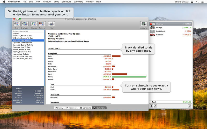- Account Summaries can once again show or hide Resolved Entries, Tax-Deductible Entries, and Checks.