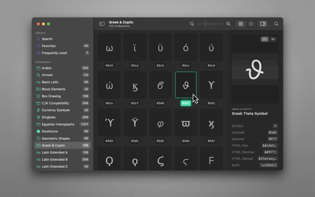 70,000+ Unicodes in your pocket. Search Unicodes, Glyphs, SF Symbols and Emojis in a blink. Codepoint helps you to find the exact characters you need and supports you in discovering new glyphs. Export them as Symbols, Strings, Hexadecimals, HTML entities or even Swift code. Save Favourites in iCloud. Remember your Frequently Used symbols. Codepoint is tailored for you—a creative, ambitious professional.