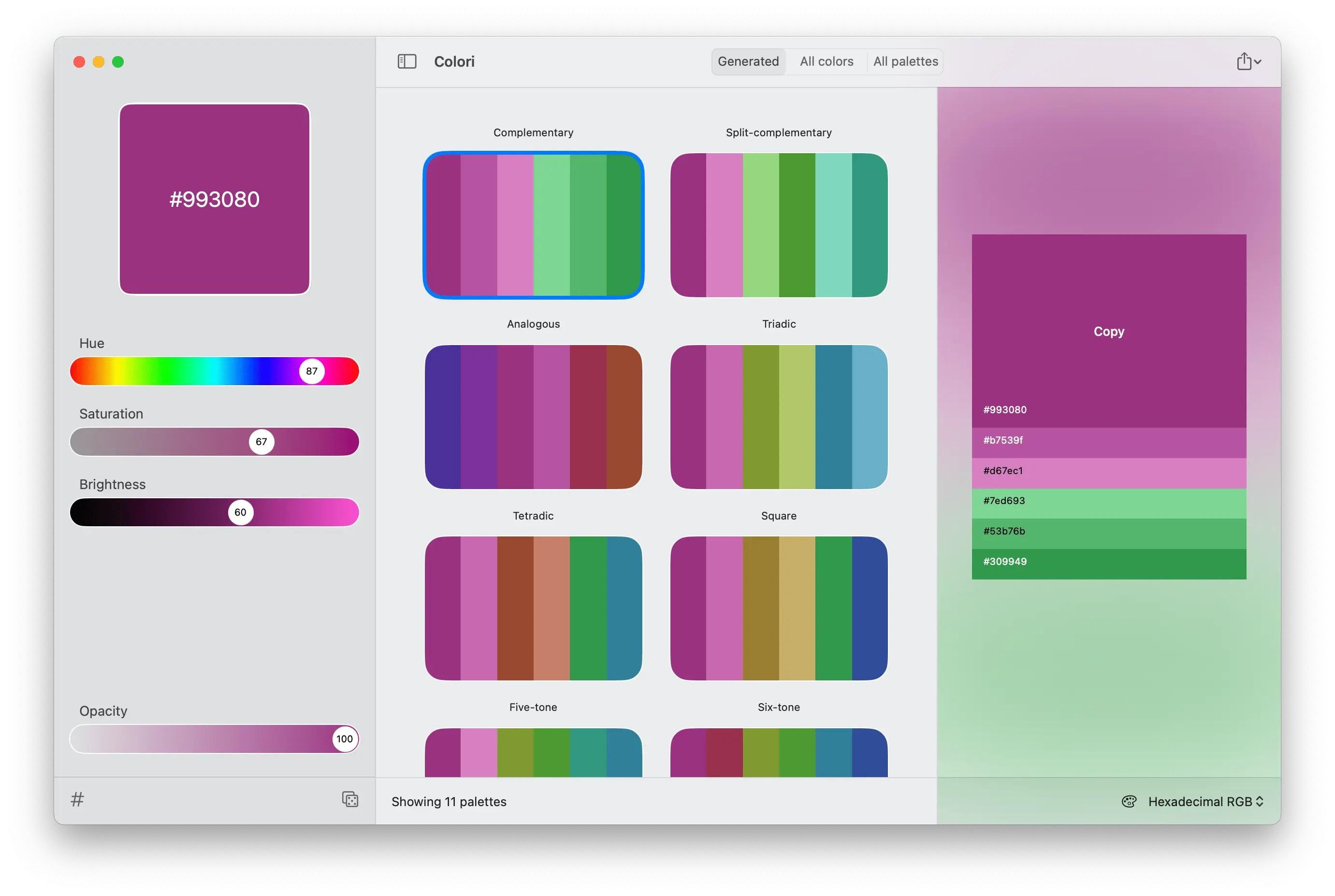 - Lots of options: Work elegantly and lightning-fast from your Mac. Do you want to export your palettes for use e.g. with web design and CSS/LESS/SASS? Done!
