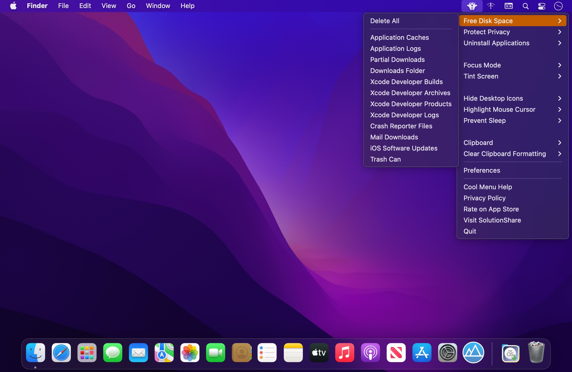 Cool Menu’s comprehensive and easily accessible “Free Disk Space” feature lets you free up Gigabytes of disk space and optimise your system performance in just a couple of clicks. You can cleanup any or all of the following items: