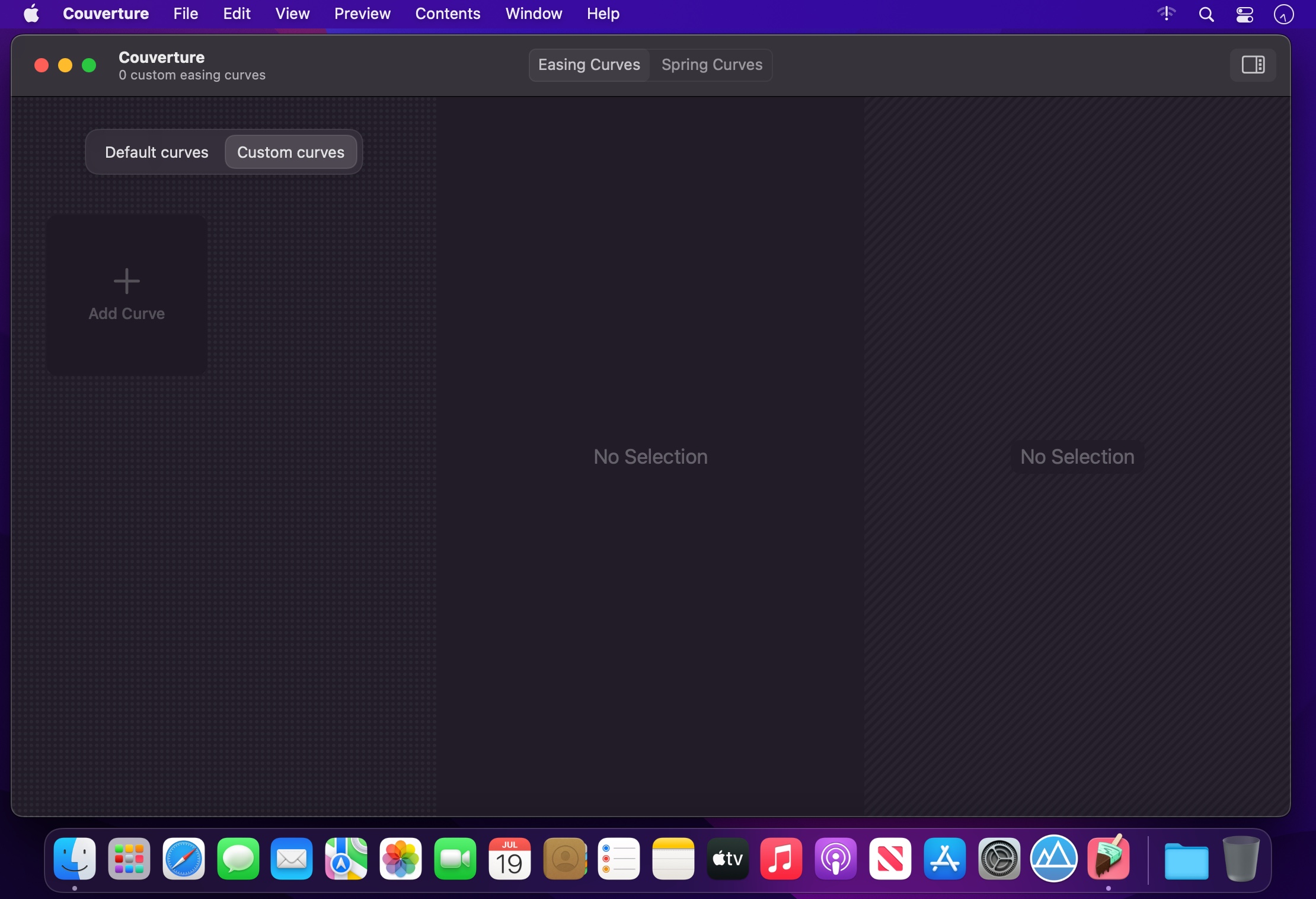 Spring, Easing or Timing Curves are made to specify the rate of change in an animation over time. Couverture lets you manage, edit and preview those curves in realtime. It is a powerful way to create sophisticated animations for your creative projects.