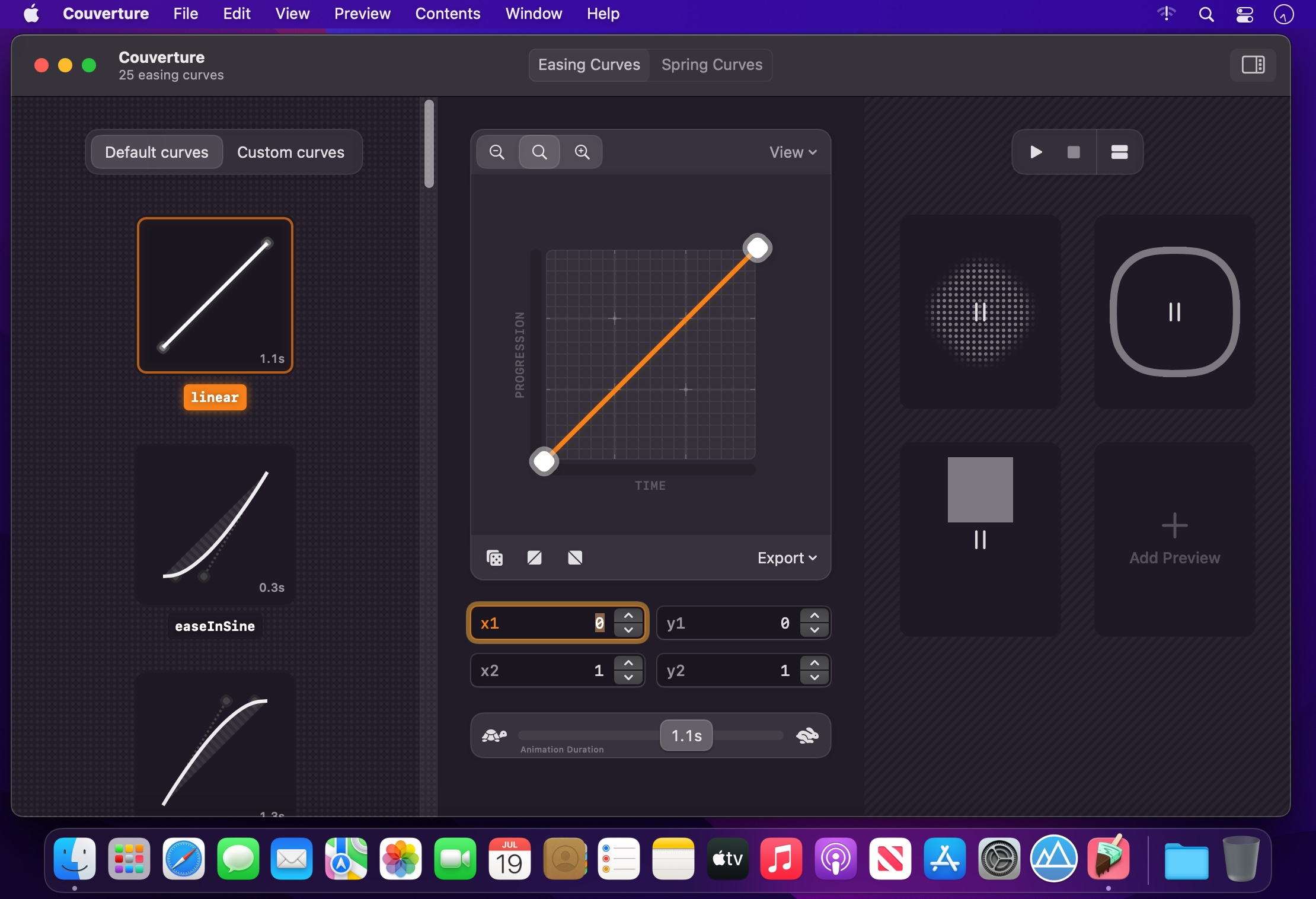 Spring, Easing or Timing Curves are made to specify the rate of change in an animation over time. Couverture lets you manage, edit and preview those curves in realtime. It is a powerful way to create sophisticated animations for your creative projects.