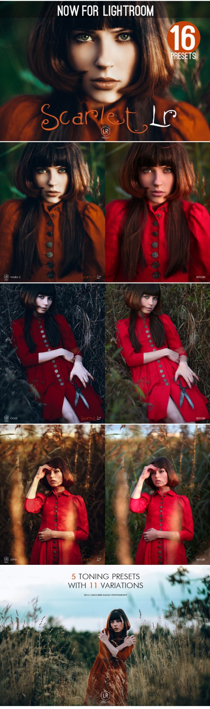 CreativeMarket - Scarlet Fantasy Lightroom Presets Scarlet Lightroom Preset Bundle is a collection of advanced fantasy toning presets for natural light portraits, fashion and fine-art. It will add a rich atmospheric/fantasy tone to your photographs and give them a professional editorial look. Scarlet LR not simply recreates the effect of the original action, but features more advanced & less destructive toning technique. Now available for Lightroom with BONUS toning variations. You asked for it! INCLUDES 16 PRESETS: ・5 Lightroom toning presets: Original, Cold, Warm, Warm 2 & Sepia. ・11 preset variations (dealing with saturation, contrast & exposure). The effect of the preset may vary, depending on individual characteristics of the original photograph. However, Scarlet Lr comes with a large bundle of pre-made variations to match different lighting conditions. WORKS WITH: Lightroom 4 and higher. These presets are for Adobe Lightroom only and won't work in Photoshop! INSTALLATION: Standard for LR presets. Installation instructions can be found inside the archive. Web Site: https://creativemarket.com/kuzmin/253692-Scarlet-Fantasy-Lightroom-Presets