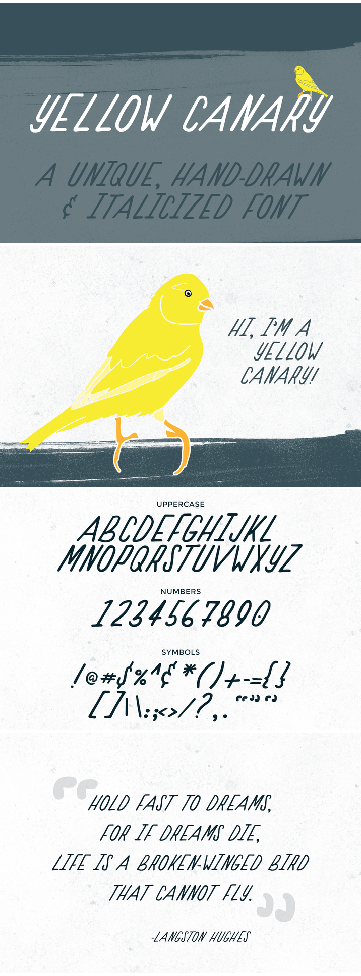 Name : Yellow Canary Font Files : OTF File Size : 15.31 KB Vector : Yes The Yellow Canary font is a perfect way to add a hand drawn lettering touch to your designs, whether you use it on a printable greeting card, in a scrapbook, or elsewhere. The font was carefully created by hand using a thin brush marker and features a full set of glyphs including uppercase letters, numbers, and symbols. Add this quirky hand lettered font to your font repertoire and use it for any number of occasions. This font comes fully equipped with the symbols you need! Files Included: OTF, Thank you note Link for more information: https://creativemarket.com/hijenncoyle/419961-Yellow-Canary-Font