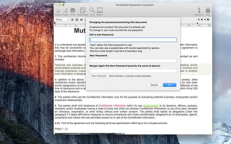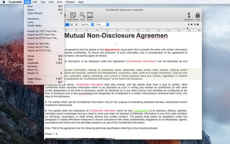 CryptoEdit allows you to edit documents with a simple word processor. It can handle text and images. All the features available in a modern, Cocoa-based RTF editor are available in CryptoEdit. Text may be formatted using rulers, styles, and fonts of different sizes and colors. All font selections are available from standard menu dialogs and custom styles may be used.