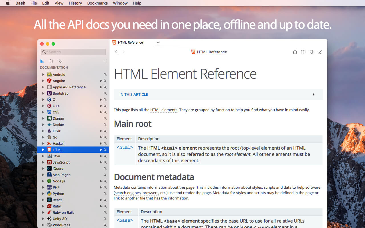 - Offline Documentation: iOS, OS X, watchOS, Swift, Man Pages, .NET Framework, ActionScript, Akka, Android, AngularJS, Angular.dart, Ansible, Apache, Appcelerator Titanium, AppleScript, Arduino, Backbone, Bash, Boost, Bootstrap, Bourbon, Bourbon Neat, C, C++, CakePHP, Cappuccino, Chai, Chef, Clojure, CMake, Cocos2D, Cocos2D-X, CodeIgniter, CoffeeScript, ColdFusion, Common Lisp, Compass, Cordova, Corona, CSS, D3.js, Dart, Django, Dojo Toolkit, Drupal, ElasticSearch, Elixir, Emacs Lisp, Ember.js, Emmet.io, Erlang, Express.js, Expression Engine, ExtJS, Flask, Font Awesome, Foundation, GLib, Go, Grails, Groovy, Grunt, Haml, Haskell, HTML, Jade, Jasmine, Java SE, Java EE, JavaFX, jаvascript, Joomla, jQuery, jQuery Mobile, jQuery UI, Knockout.js, Kobold2D, Laravel, LaTeX, Less, Lo-Dash, Lua, Marionette.js, Meteor, MomentJS, MongoDB, Mongoose, Mono, MooTools, MySQL, Nginx, Node.js, NumPy, OCaml, OpenCV, OpenGL, Perl, PhoneGap, PHP, PHPUnit, Play Framework, Polymer.dart, PostgreSQL, Processing.org, Prototype, Puppet, Python, Qt, R, Redis, RequireJS, Ruby, Ruby on Rails, Rust, Sass, SaltStack, Scala, SciPy, Sencha Touch, Sinon, Smarty, Sparrow, Spring Framework, SproutCore, SQLAlchemy, SQLite, Statamic, Stylus, SVG, Symfony, Tcl, Tornado, Twig, Twisted, TYPO3, Underscore.js, Unity 3D, Vagrant, Vim, VMware vSphere, WordPress, Xamarin, Xojo, XSLT, XUL, Yii, YUI, Zend Framework, Zepto.js.