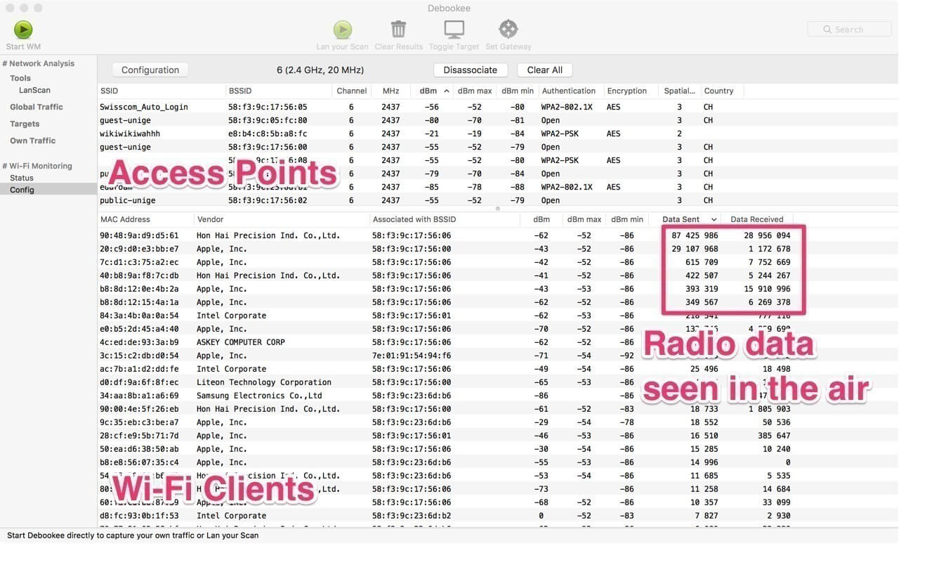 - Monitor activity of all Wi-Fi devices around you, access points, and clients