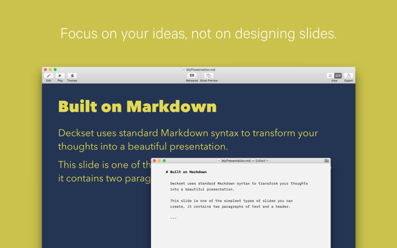 Deckset is a new, simple way to create presentations. Open your favorite text editor, write down your thoughts, and Deckset will turn them into beautiful presentations. Focus on your ideas, not on designing slides.