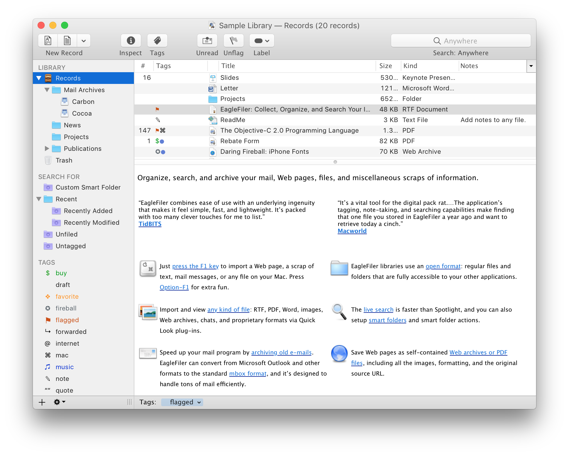 EagleFiler makes managing your information easy. It lets you archive and search mail, Web pages, PDF files, word processing documents, images, and more. Use it to collect information from a variety of sources. Browse different types of files using a standard three-pane interface. Organize them into folders and annotate them with tags and notes, or leave everything in one folder and pin-point the information you need using the live search. Since EagleFiler stores its library in Finder format, you can use it in concert with the other tools in your Mac ecosystem.