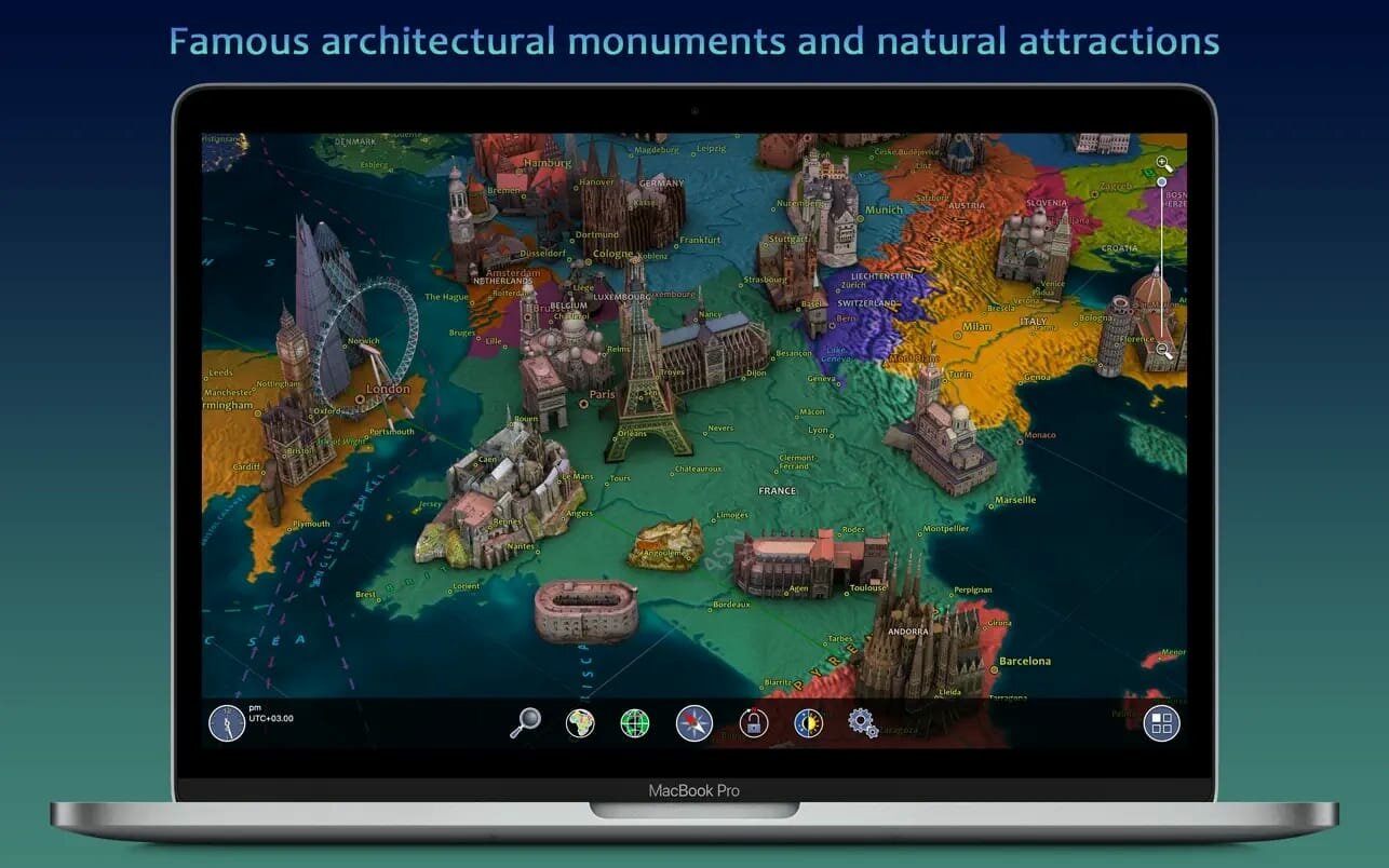 This interactive 3D globe features wonders of the world, political and physical maps, and weather. Discover a lot of fascinating facts and useful information about our planet! Original and colorful graphics, user-friendly interface and accurate information – this is what Earth 3D – World Atlas is all about!