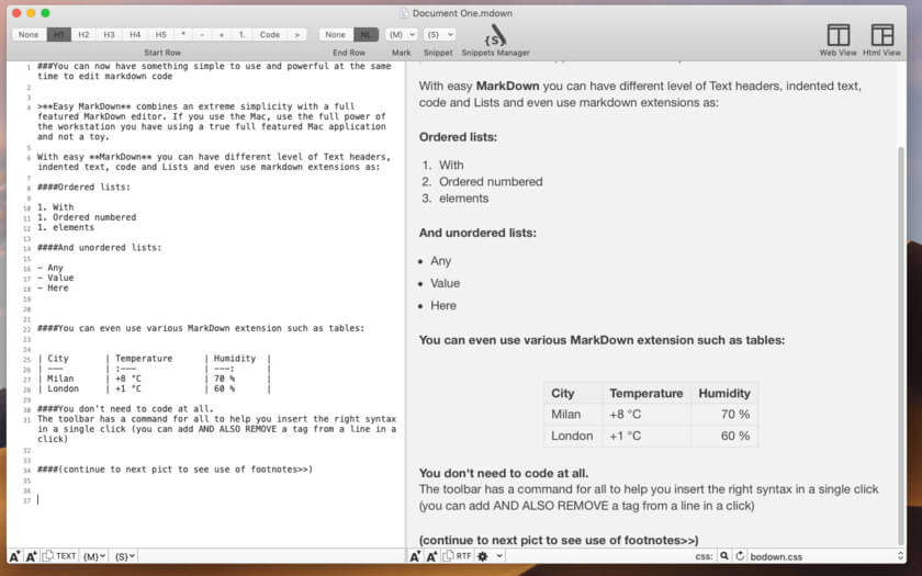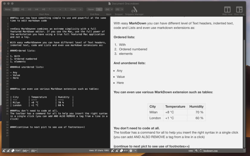 Easy Markdown lets you create Web pages just writing plain text with Markdown syntax. In Easy Markdown the window is split in two parts. As you type plain text on the left, you see on the right the resulting web page as it will be seen on the web.