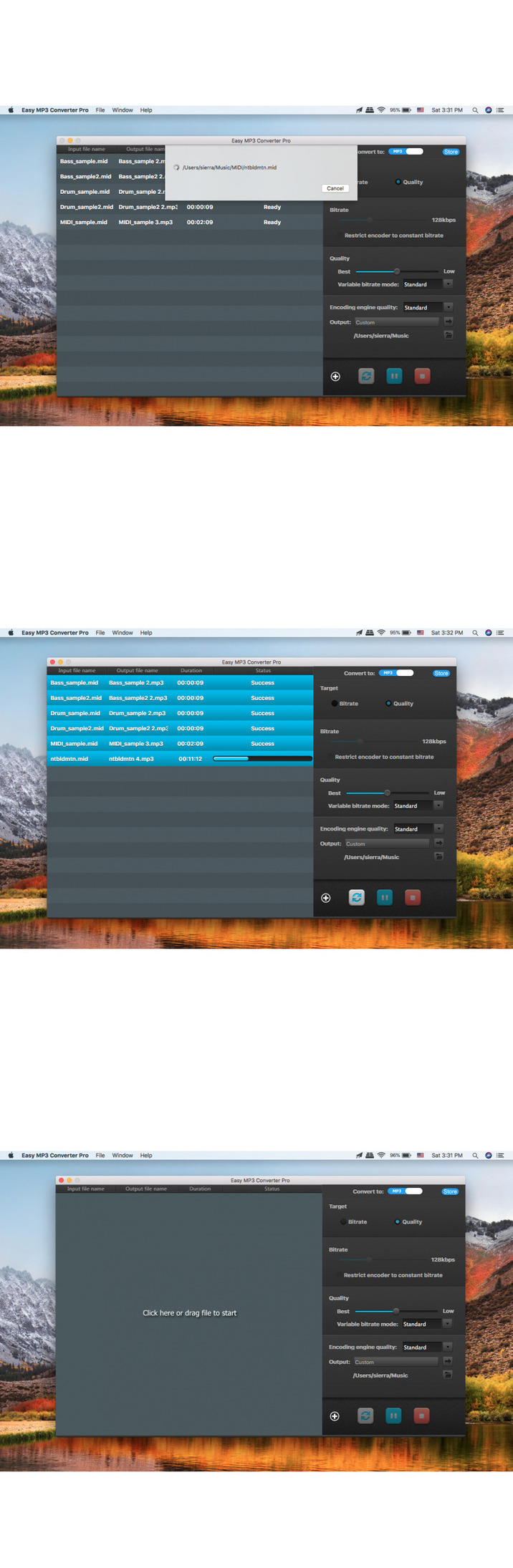 Easy MP3 Converter Pro is a professional music converter software, it can convert all popular music formats to mp3 format. It also supports separate audio from video and convert to MP3.This version supports MIDI to mp3 and M4A conversions. It is very simple, does not require professional skills, like other audio formats, drag MIDI files to the program, one click to convert it to mp3 or M4A format.