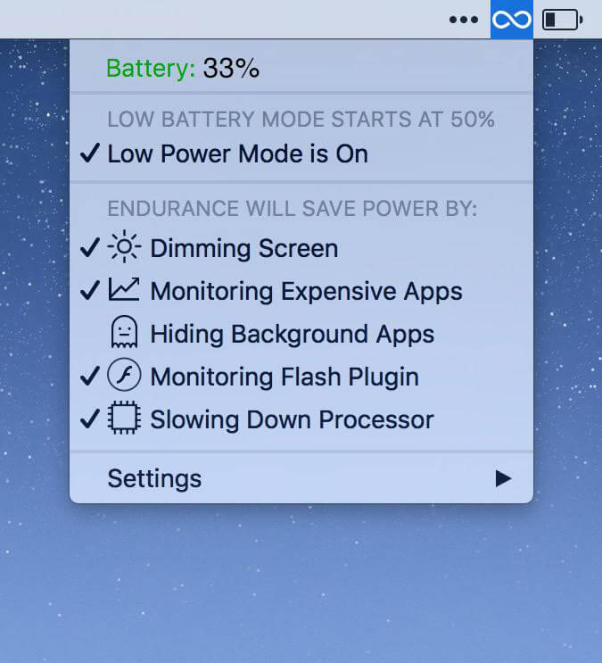 No matter how good your battery is, everyone could use a little more battery power! Endurance is an app that helps your Mac run longer. Endurance runs in the background and when your battery level drops to a certain level, it automatically starts adjusting your settings and turning off features which use a lot of energy. Our tests have shown that it can give you about 20% more runtime, which you can spend writing, browsing the web and watching movies.