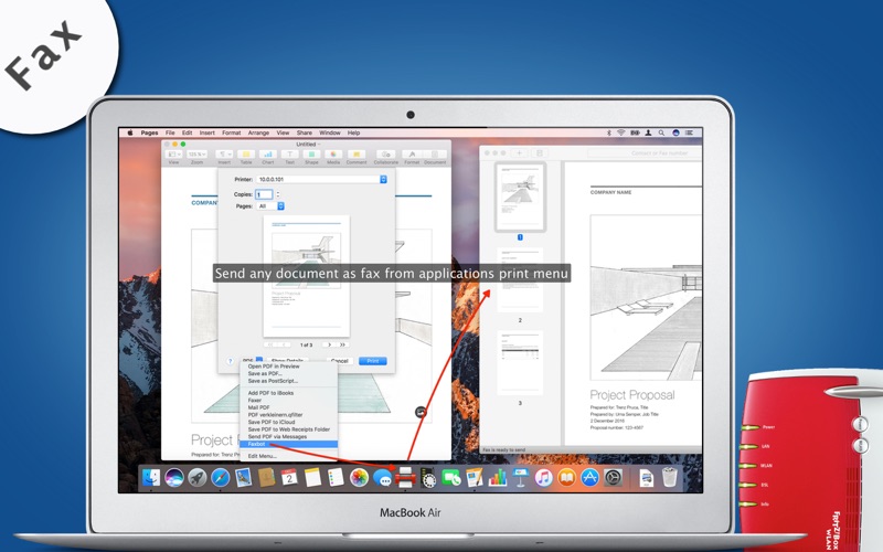 Send Faxes on Mac via FRITZ!Box. With Faxbot you can comfortable send faxes on your Mac via your FRITZ!Box. Faxbot offers you extensive opportunities to integrate faxing into your best workflow. Aou can open PDF, PNG or JPEG files in Faxbot and send it, create fax documents from any application, which offering you a print dialog, write and formate faxes directly into Faxbot or pass fax documents via AppleScript to Faxbot.