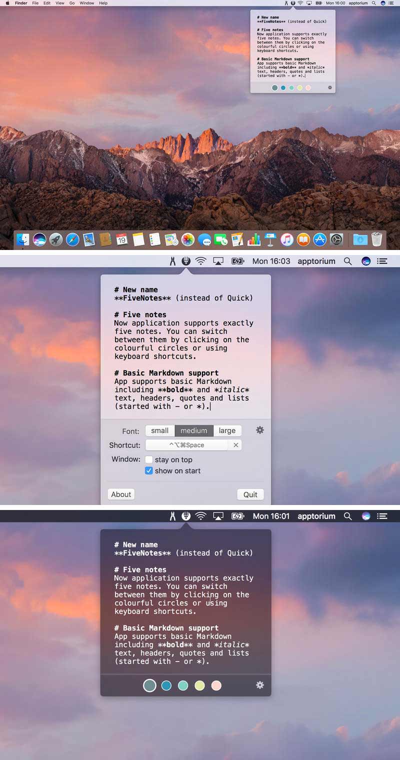FiveNotes (formerly known as Quick) is a small text editor that you can always access by clicking (or pressing shortcut keys) on its mtatus-bar icon, even if you’re working in a full-screen app. If you prefer, it can stay on top of the window so it can be used as a cheat-sheet app. FiveNotes offers exactly 5 notes that can be switched using colourful circles under the text area or by pressing shortcut (Cmd+Shift+[ and Cmd+Shift+] or Cmd+number-of-note).
