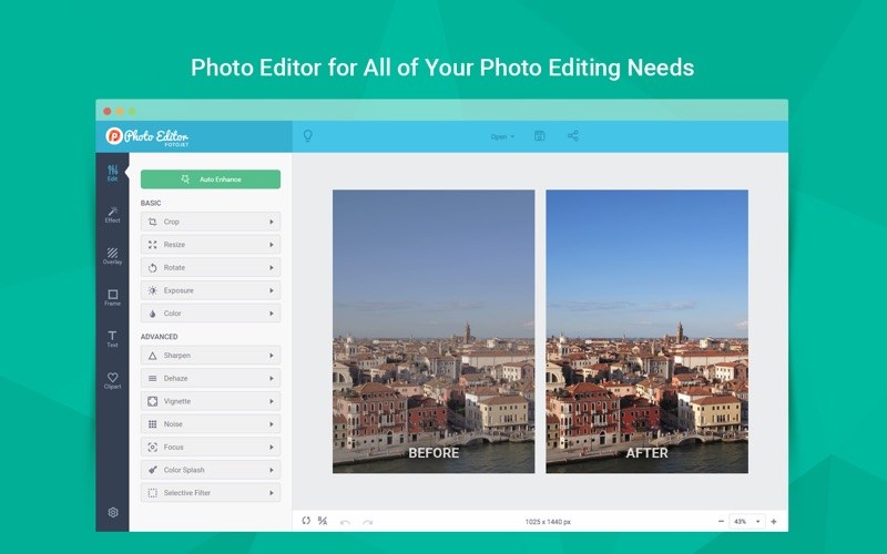 FotoJet Photo Editor enables everyone to be a photo editing expert in no time at all. It allows you not only to edit photos and apply amazing filters easily, but also add overlays, frames, text, cliparts, etc. to touch-up your images in a simple way.