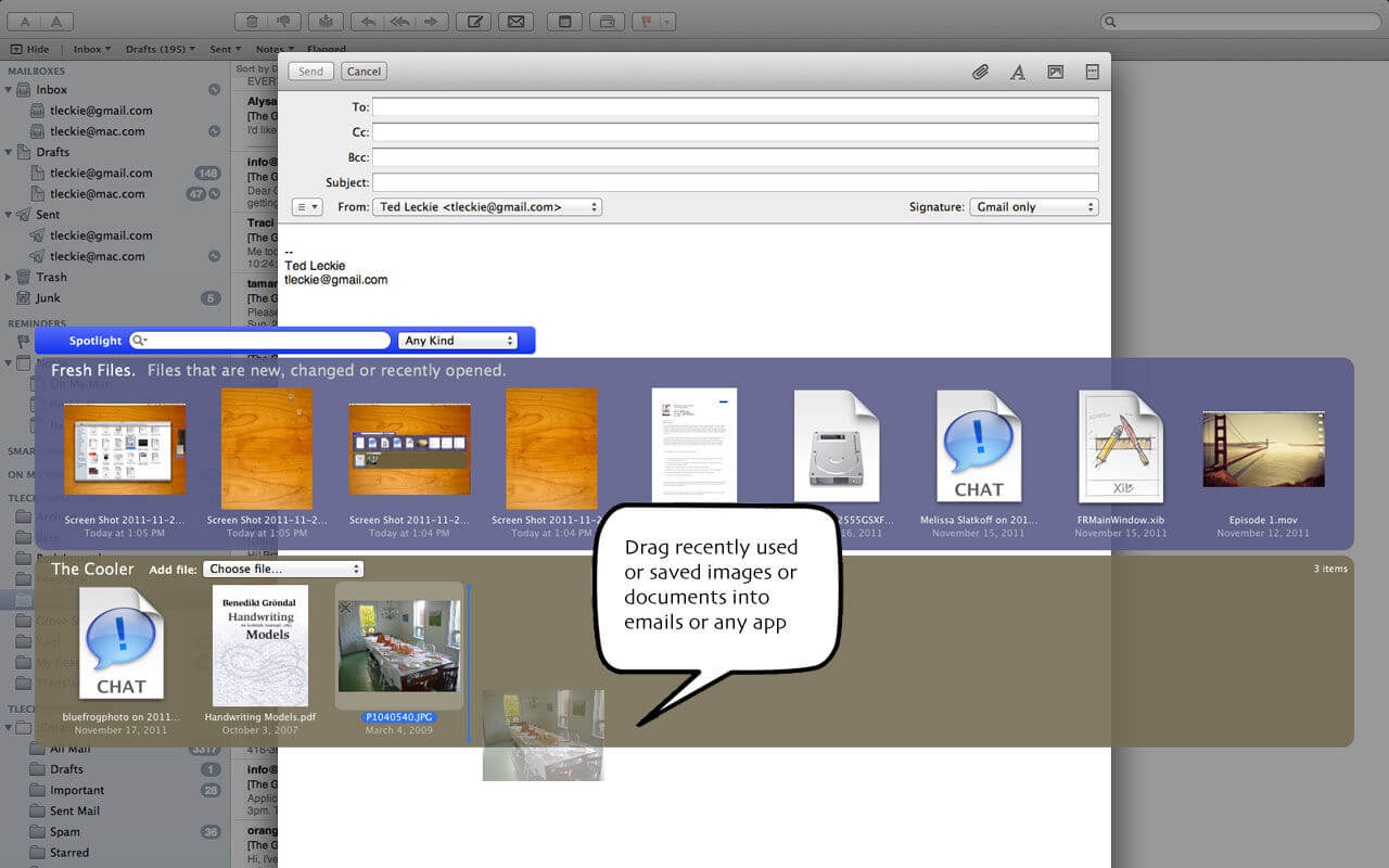 Fresh allows you to instantly find attachments you download, no matter what weird name they have. Rename files that you just downloaded, then file them with a single click.