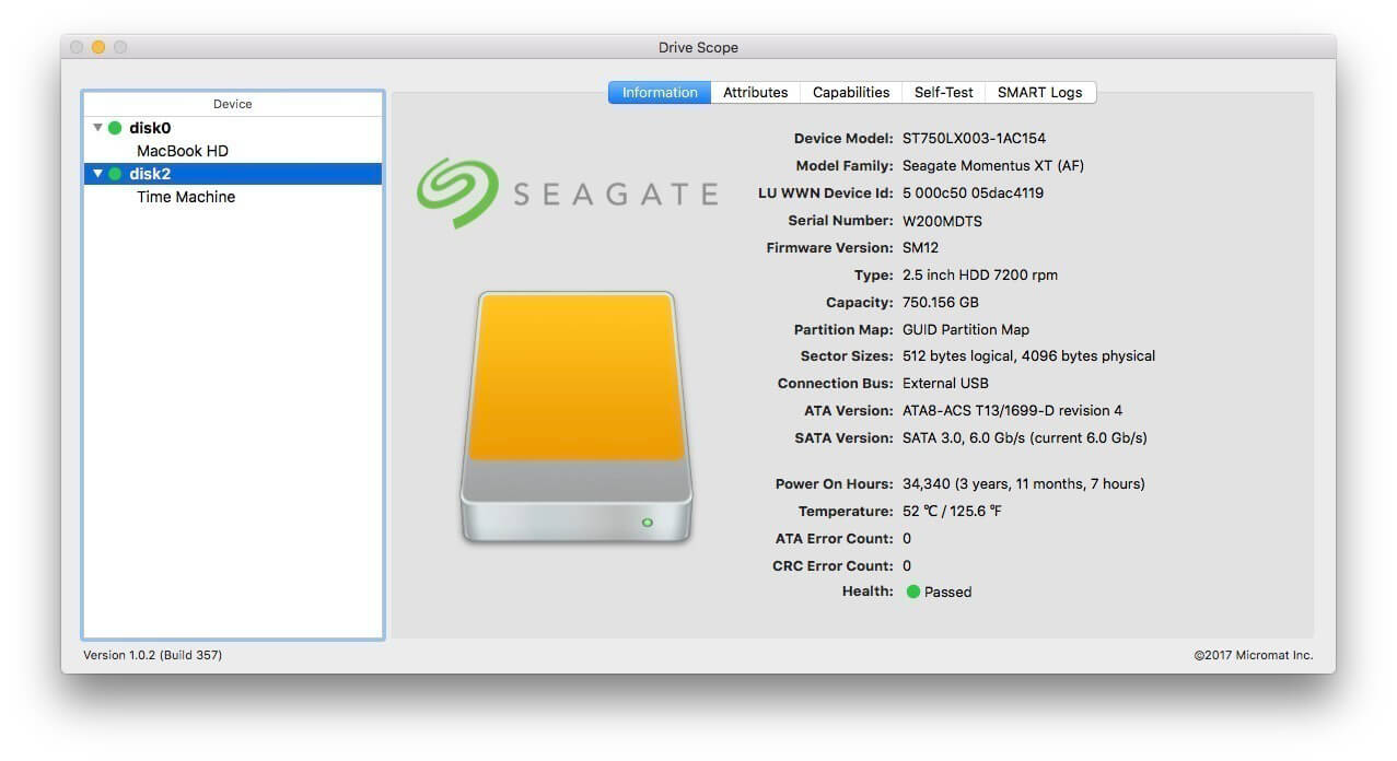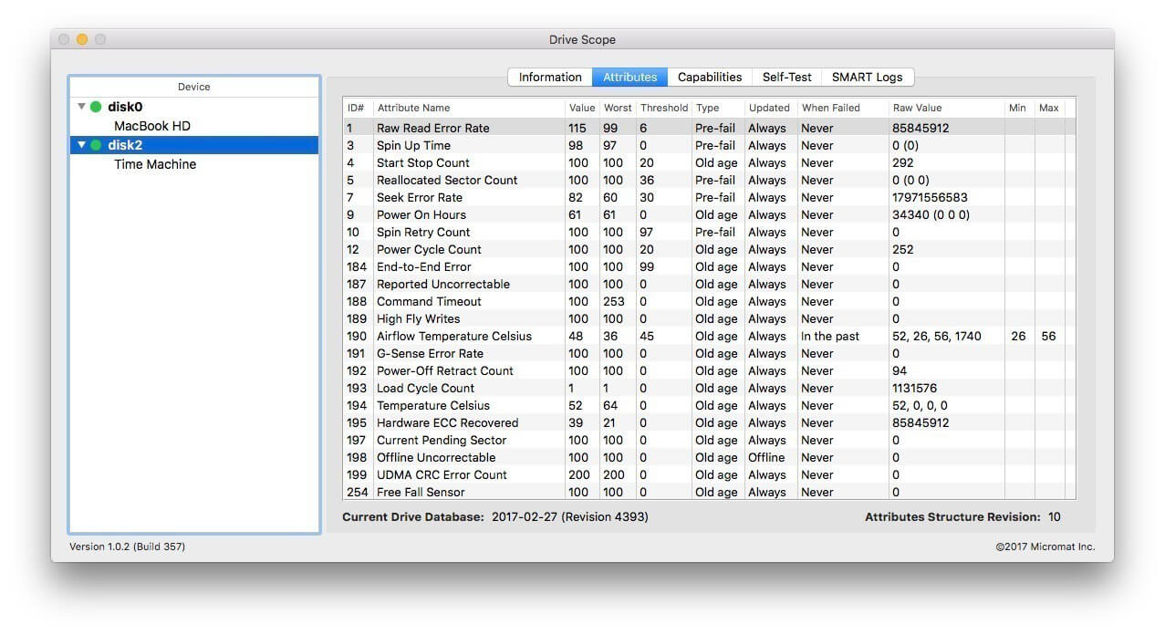 Drive Health With Drive Scope you can see the complete picture of your Drive’s health. Granular information about each aspect your drive is monitoring is available for review. See each of the attributes that contribute to the drive’s health – in detail. See which attributes contribute to overall failure versus those that are merely informational. Modern Solid State Drives The latest Macs’ solid state drives replace the aging SATA connection with a new connection type, known as NVMe. This connection, until now, didn’t allow sharing of the drive’s SMART data. These modern SSDs display their health data a little differently, so you’ll see a different selection of tabs for these drives. Control over Testing Typically, a drive will check it’s SMART attributes whenever it is convenient. With Drive Scope, you can manually trigger the drive’s internal tests to make sure the SMART data is as up-to-date as possible. Check how long since the last time the drive ran a test with the drive’s testing log. Information When you first open Drive Scope, an information page is displayed, summarizing all the critical information about your drive. See Drive Scope’s advanced health assesment at a glance, along with the number of errors encountered, as well as model and capacity information specific to your drive. Compatibility: Intel-based Macs OS X 10.8.5 or greater, including macOS 10.13 ‘High Sierra’ Homepage https://www.micromat.com/