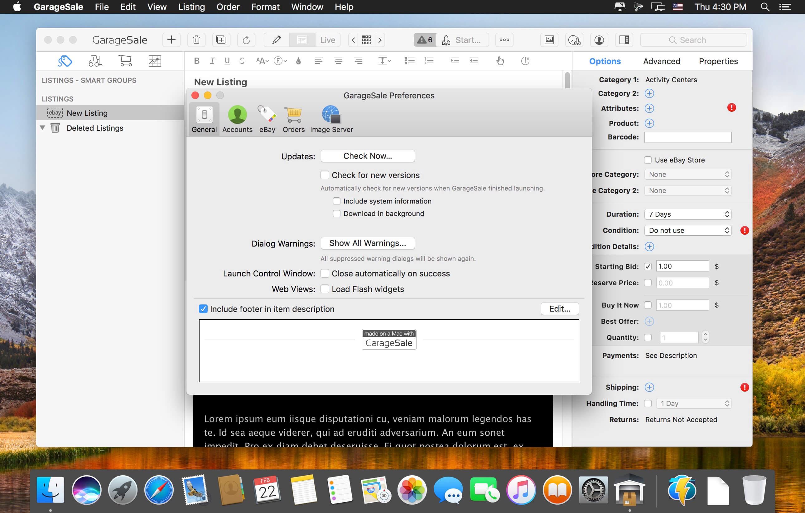 Develop professional, attractive listings. GarageSale features iPhoto integration, what-you-see-is-what-you-get (WYSIWYG) text editing, free image hosting, and over 130 free auction designs. And with these features, among many more, it’s never been easier to create professional, eye-catching eBay listings.
