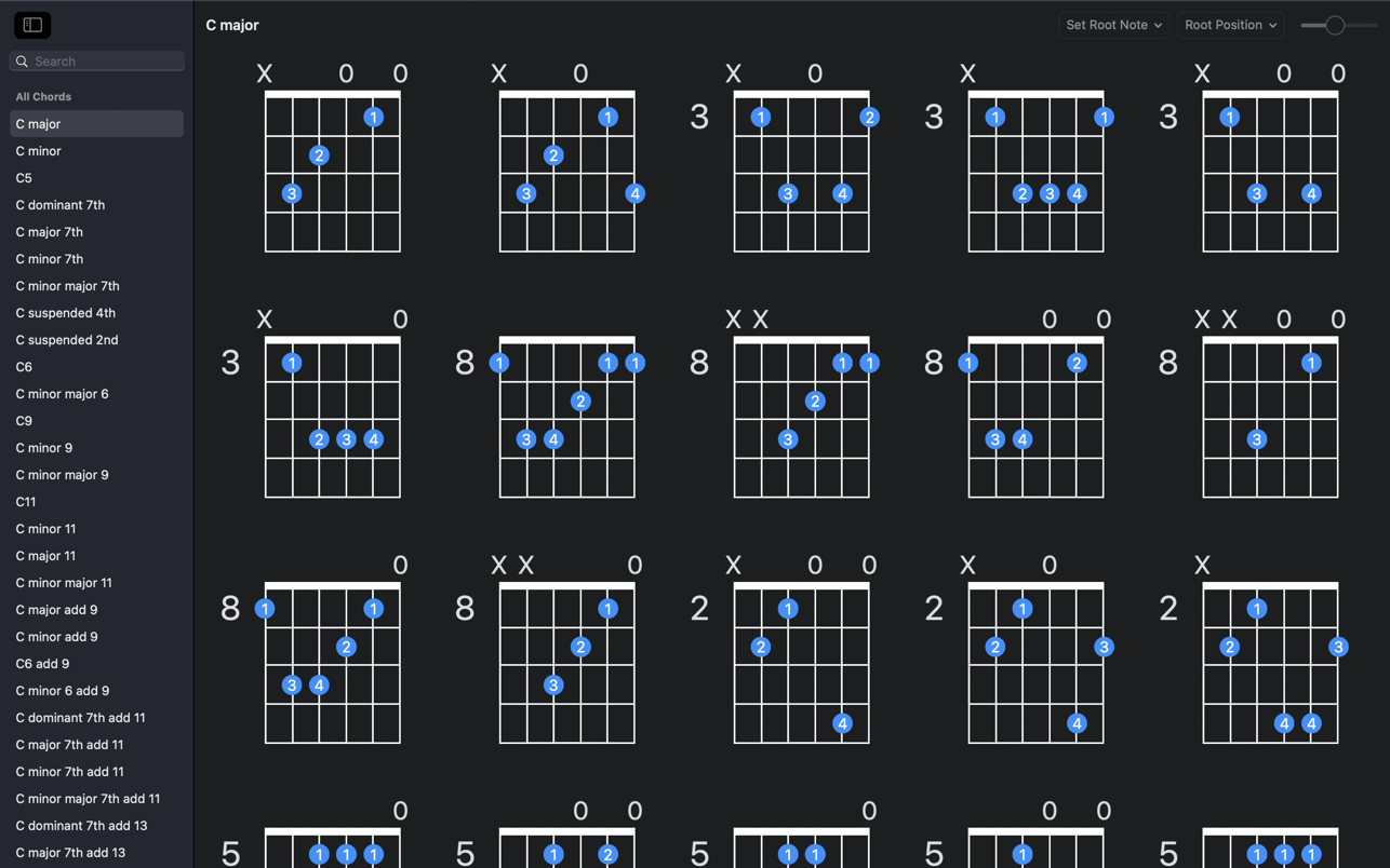 • Inversions – View the various inversions of every chord.