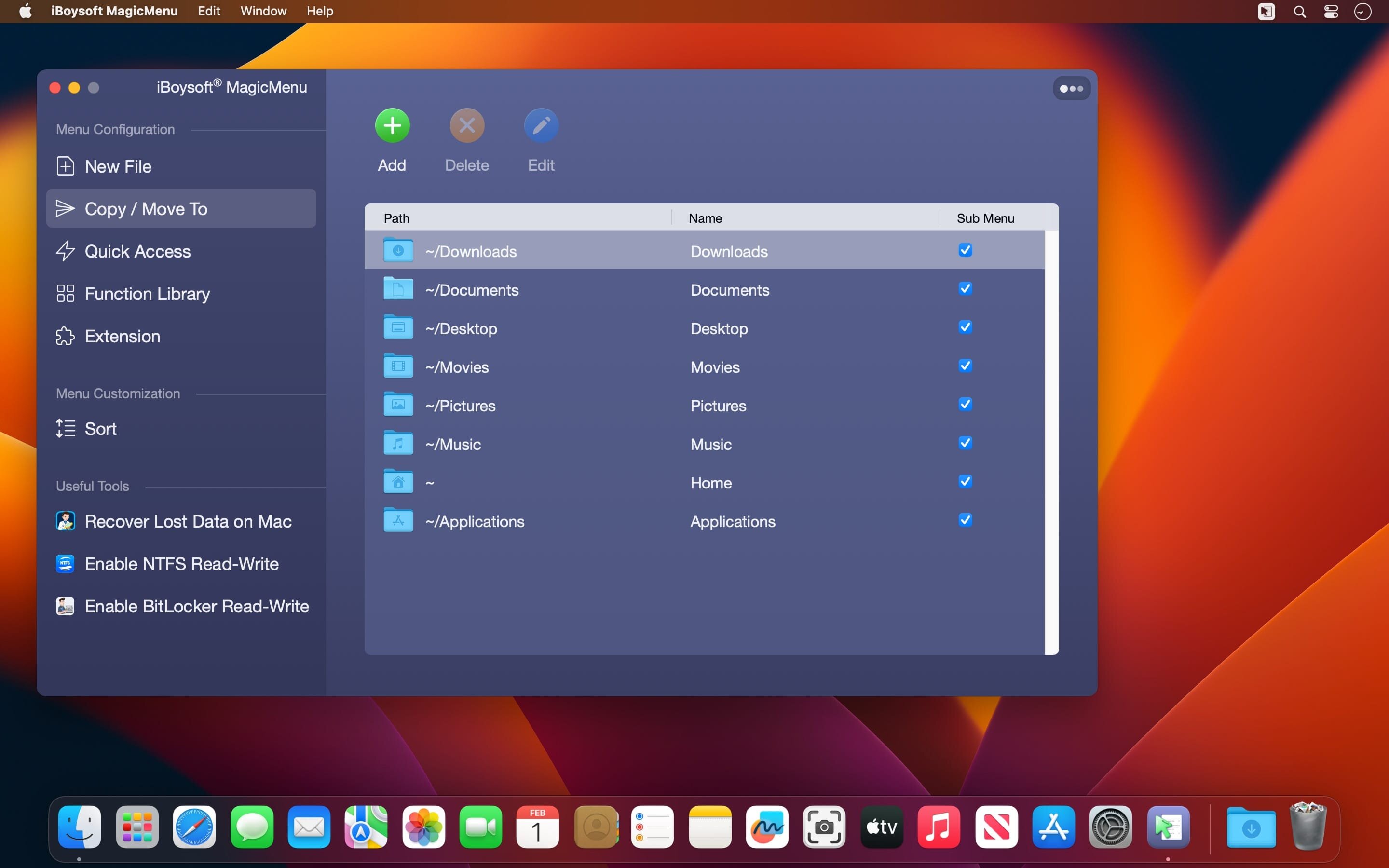 iBoysoft MagicMenu allows you to add Mac’s Library folders like Downloads, Documents, Desktop, Applications, Pictures, and Movies, user-created folders, or external disks to your right click menu for file copying.