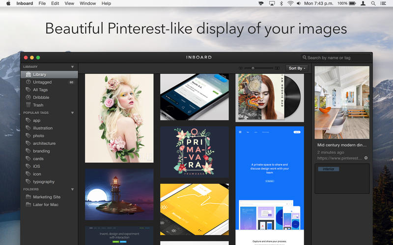Inboard helps you organize your screenshots and photos like your own private, desktop-based version of Pinterest. It helps you to organize images that otherwise get lost in Finder, and serves as an inspiration you can browse through to get inspired for your next project.