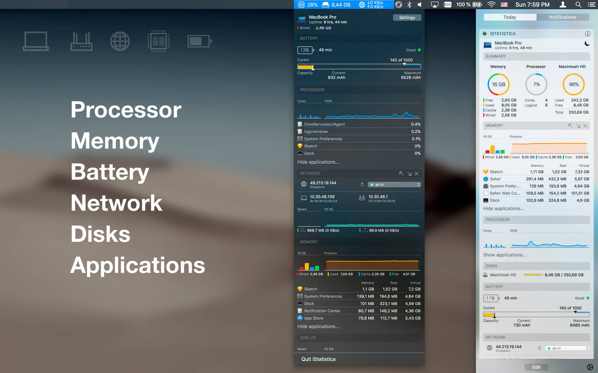 iStatistica is an advanced system monitor for macOS. It includes notification center widget and status bar menu. Simply slide out notification center to keep an eye on your CPU, memory, disk usage and network activity.