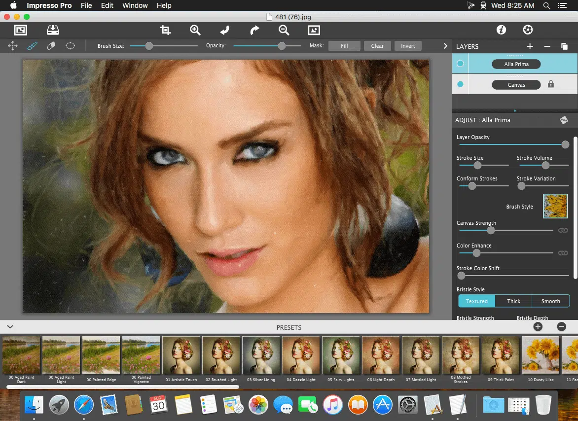 - Alla Prima (‘wet-on-wet’ or ‘all-at-once’)—is great for portraits! This beautiful paint style starts by filling the painting with an abundance of brushstrokes. A library of artistic finishes compliments this style by adding light, color and movement with controls over strength.
