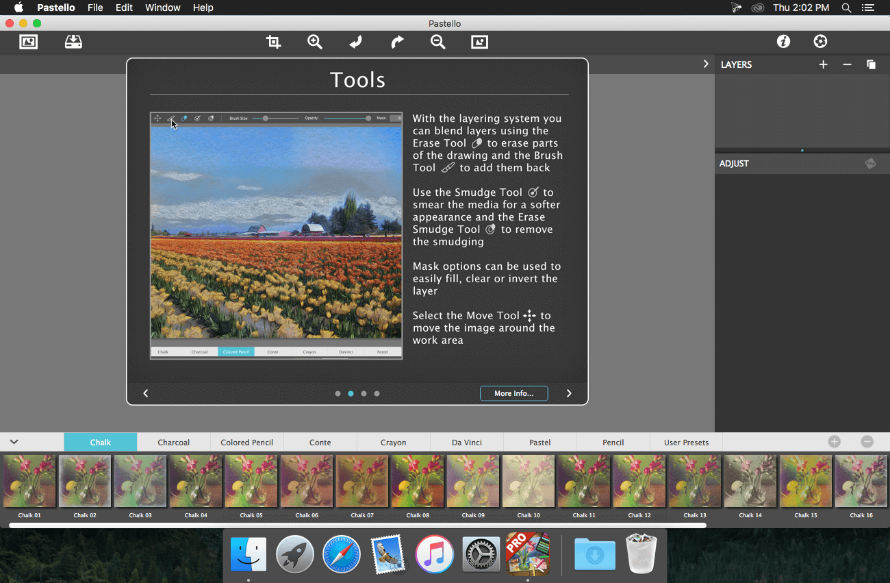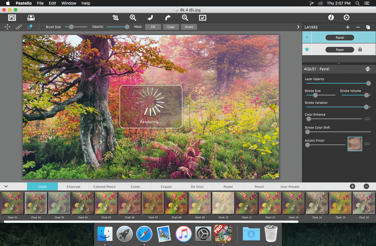 Pastello makes it simple and convenient to take an image and change it into Pastel, Chalk, Charcoal, Crayon, Colored Pencil and Graphite drawings. Use alone or combine these medias using powerful layers to produce interesting expressive sketch effects filled with colorful personality and passion. And the best part is Pastello does all the work.