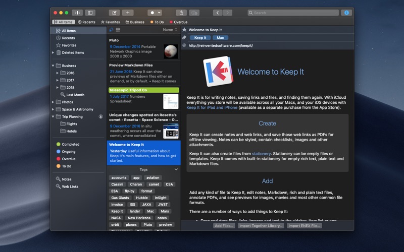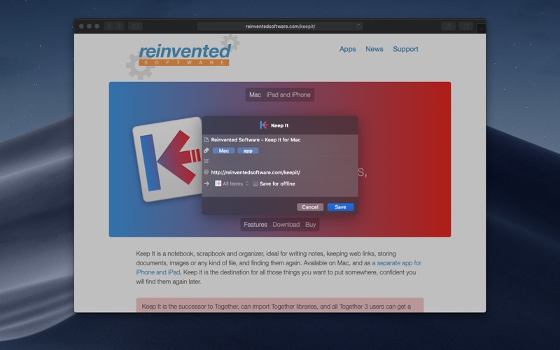 Available on Mac, and as a separate app for iPhone and iPad, changes are automatically made available across all your devices with iCloud. Keep It is the destination for all those things you want to put somewhere, confident you will find them again later.