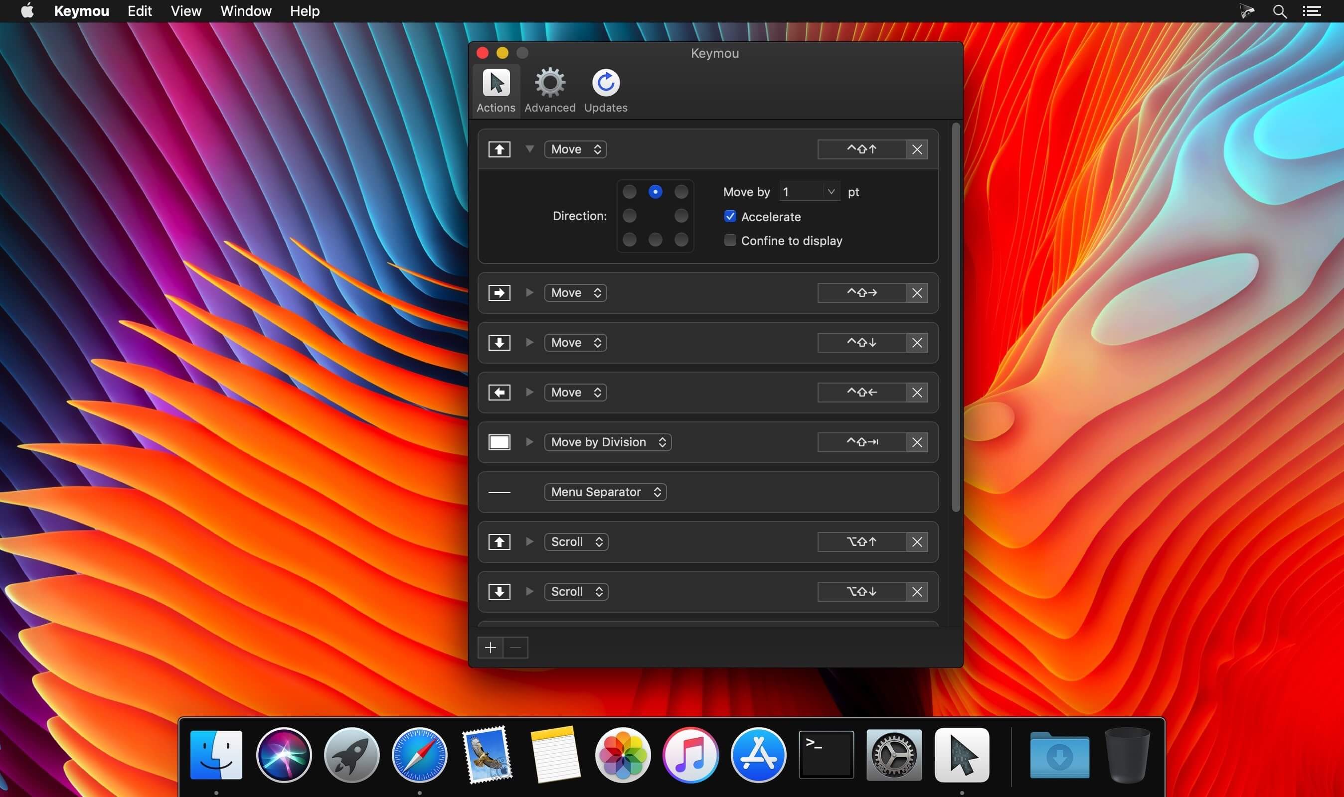 - Move: Move in the specified direction, with a user-configurable step size, acceleration, and optionally confine movement to the current display.