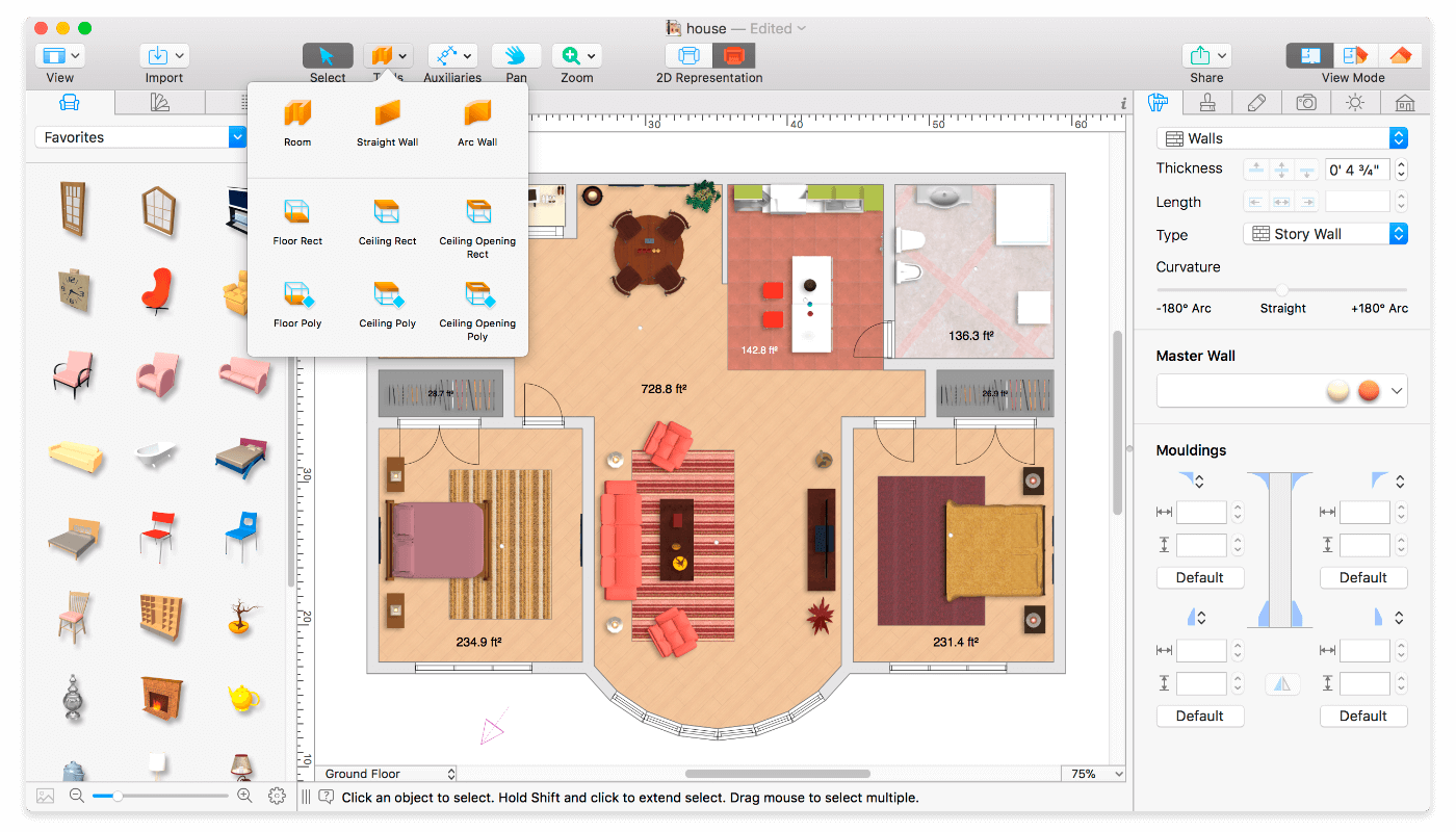- Use Arc and Straight Wall tools for drawing walls.