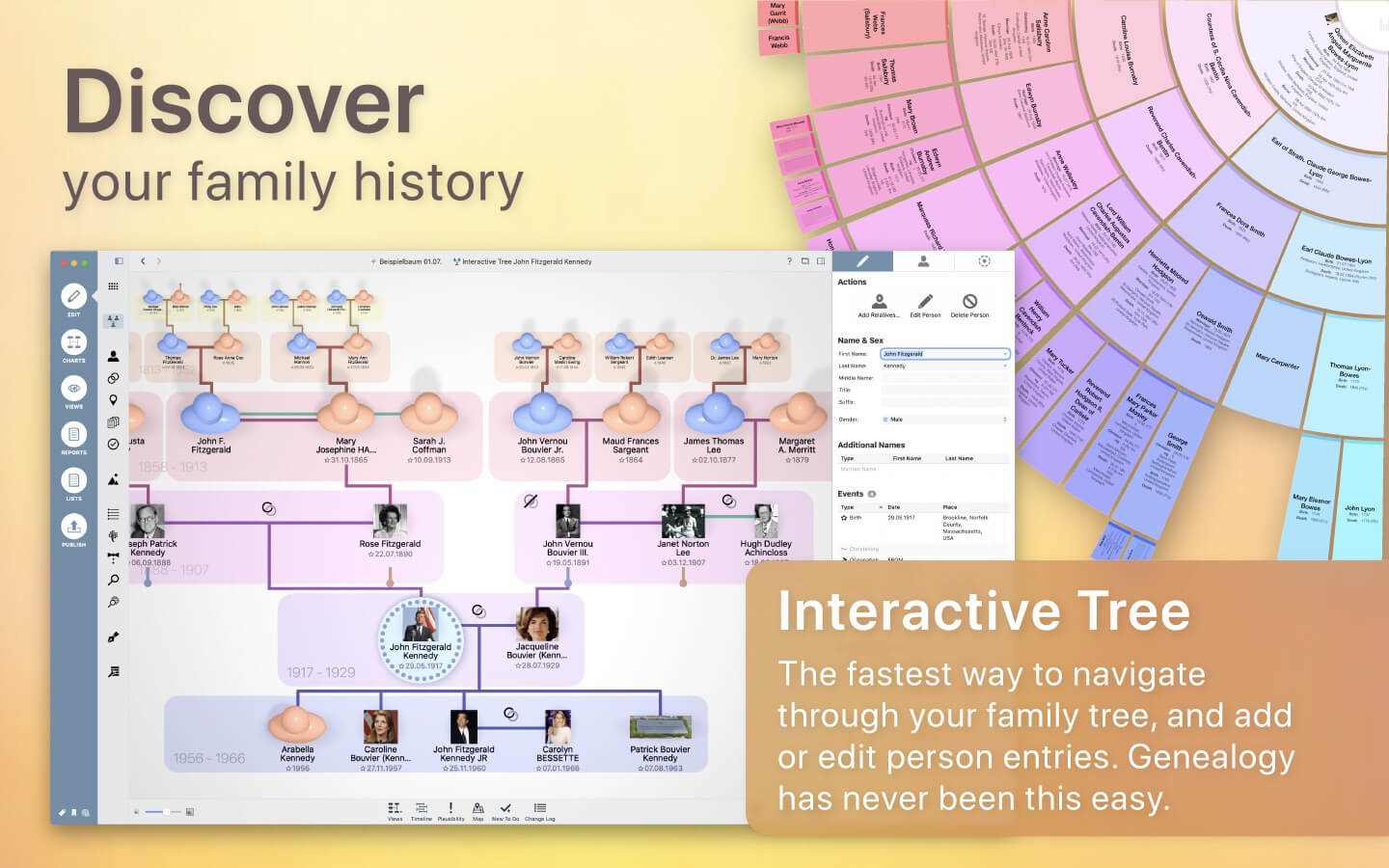 Discover your personal family history! Genealogy gets a facelift with MacFamilyTree 9: modern, interactive, convenient, and fast. Explore your family tree and your family history in a way that would have amazed generations of chroniclers before you. Create visually impressive charts, evaluations, reports, and books, navigate through the Interactive Family Tree or Virtual Tree 3D view and experience genealogy in a whole new way.