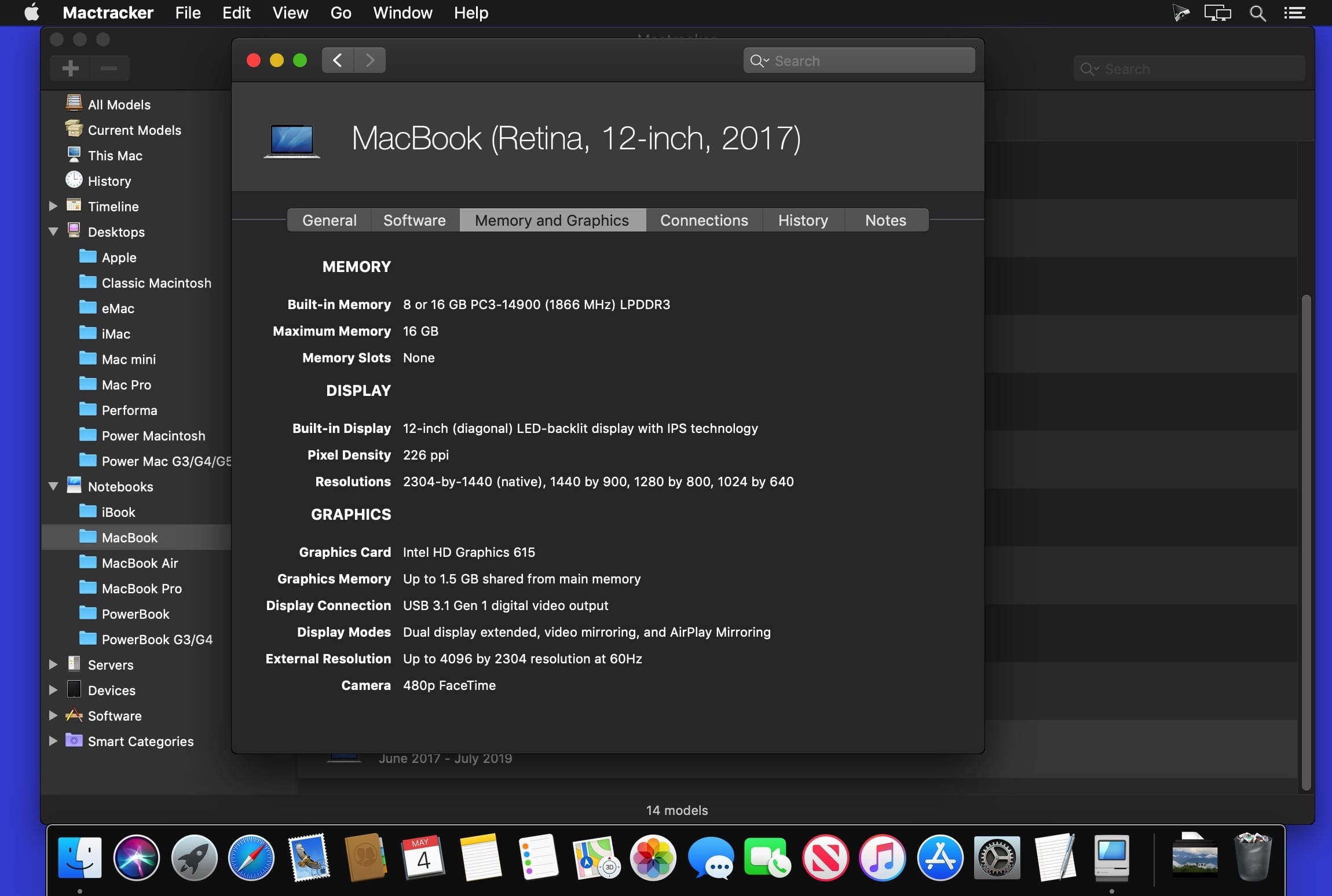 Mactracker provides detailed information on every Mac computer ever made, including items such as processor speed, memory, optical drives, graphic cards, supported macOS versions, and expansion options.