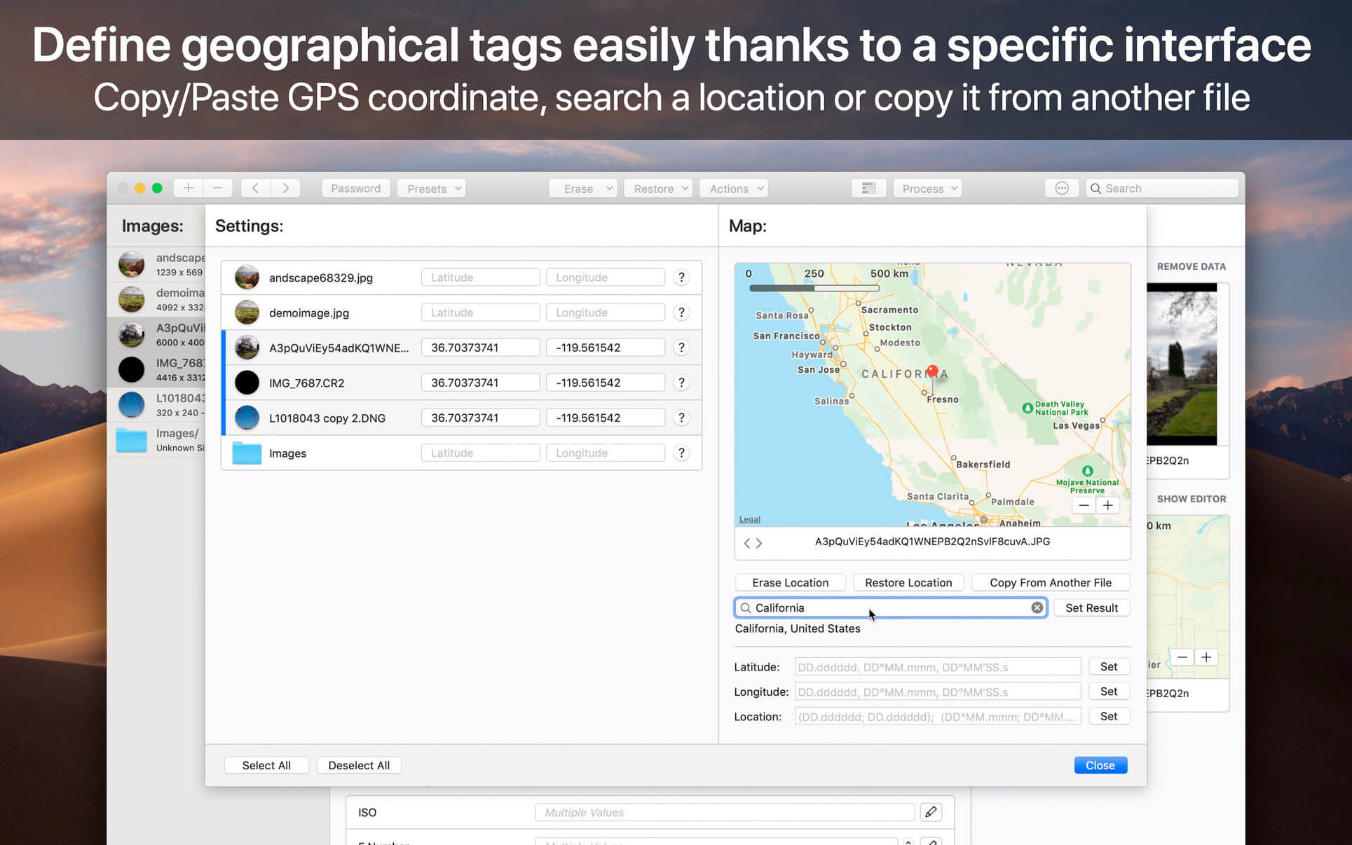 The application has been designed to improve your workflow. Users can create and manage presets. Moreover, a special support is provided for geographical and thumbnail data. In addition, displayed tags can be customized via the preferences. In this way, the application fits to your personal needs.