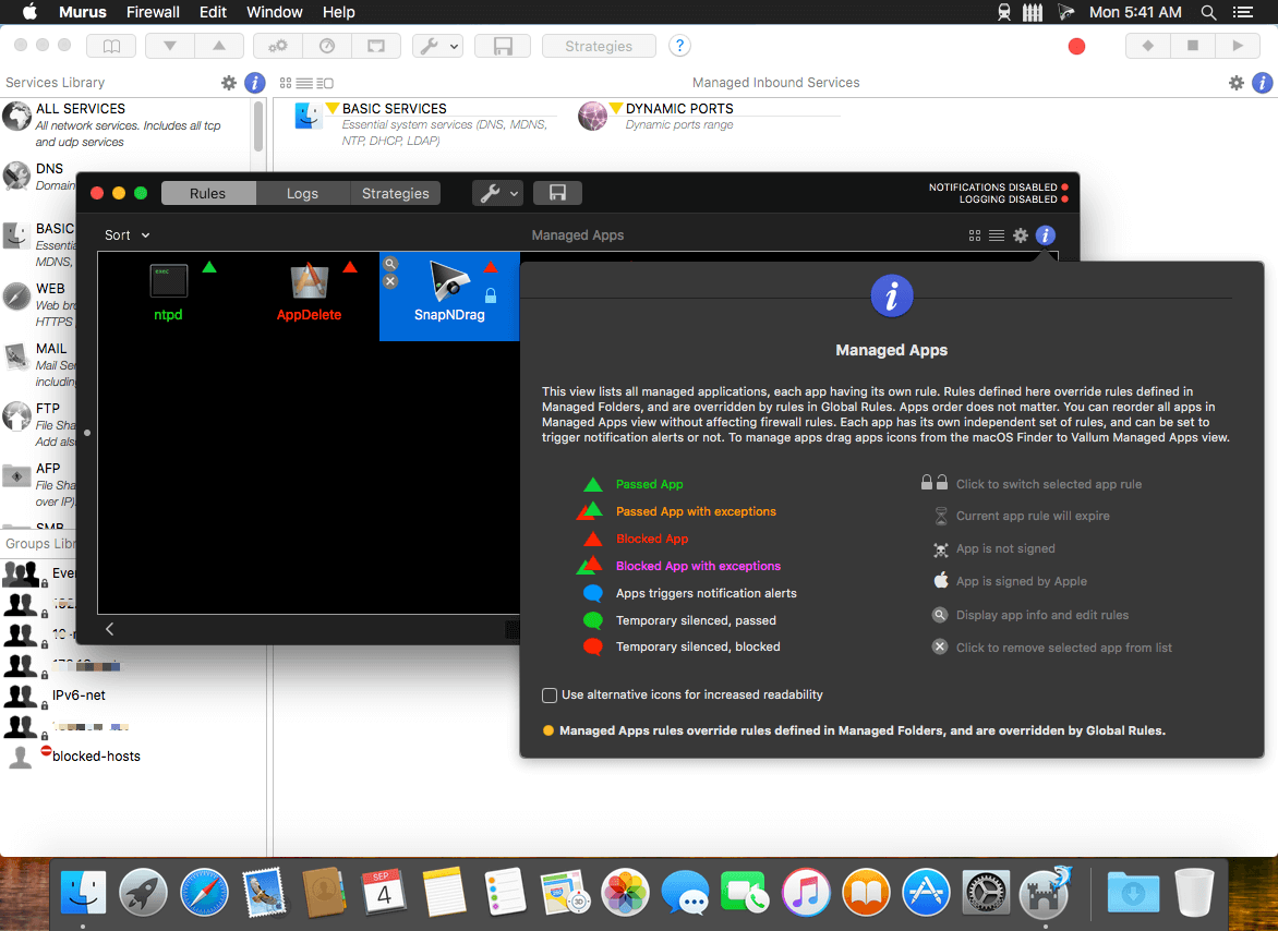Murus Pro unleashes the great power of PF, offering a very wide set of features. It is a complete frontend for PF, and is bundled with Murus Logs Visualizer, an app to analyze PF logs and statistics, and Vallum, an application-layer firewall with real-time notifications. Access all advanced options to build and maintain a fully customized network infrastructure with your Mac.
