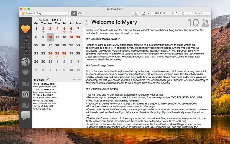 Myary is an easy-to-use app for creating diaries, project documentations, blog entries, and any other text that should be saved in conjunction with a date.