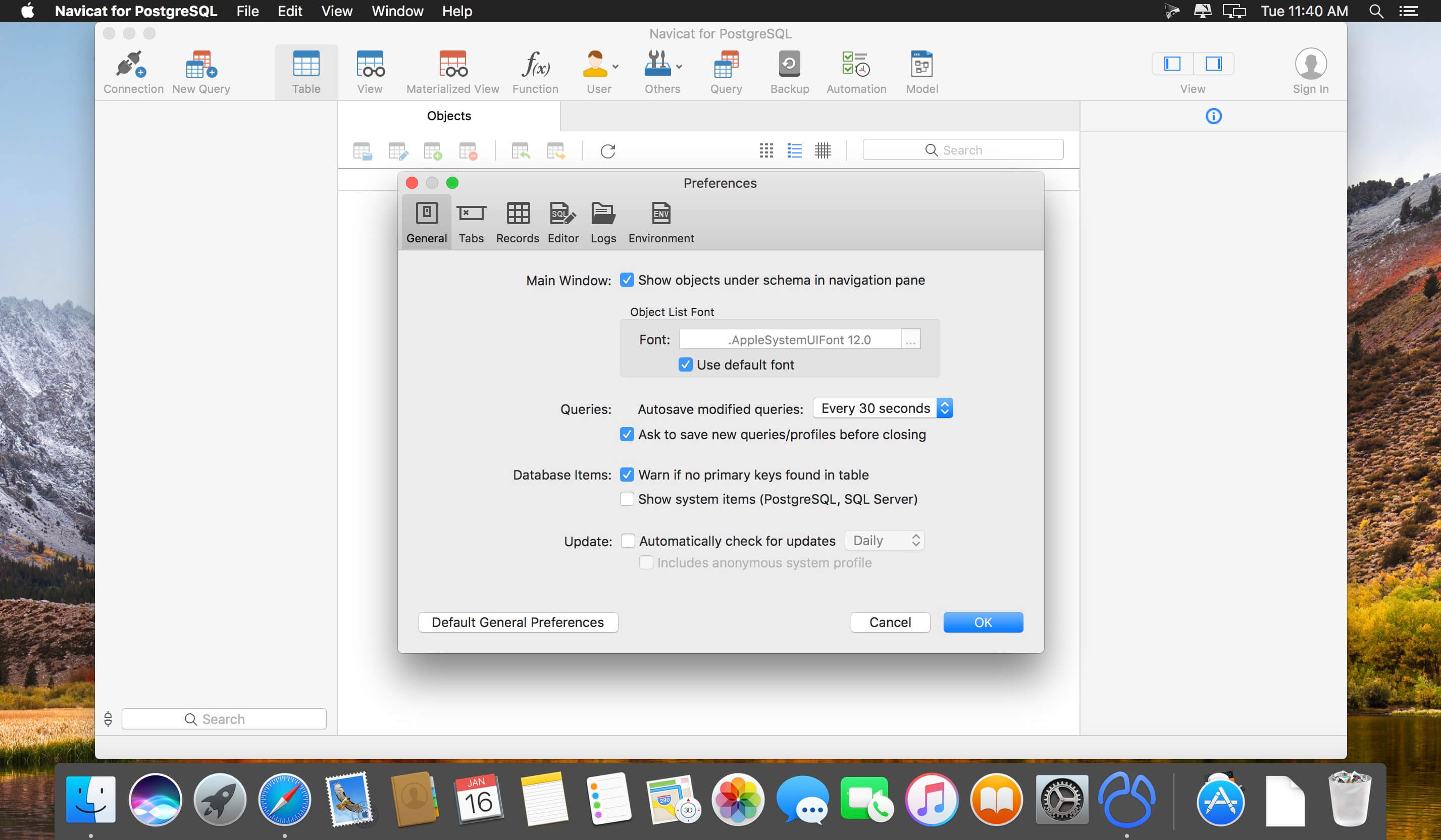 Navicat for PostgreSQL is a powerful yet easy-to-use PostgreSQL graphical interface that provides extensive functionality for managing and developing PostgreSQL database. Advanced features allow you to create database models, import/export data, backup, transfer databases, create queries, and manage your local or remote SQLite server. It also includes a full-featured graphical manager for setting the users and access privileges and more.