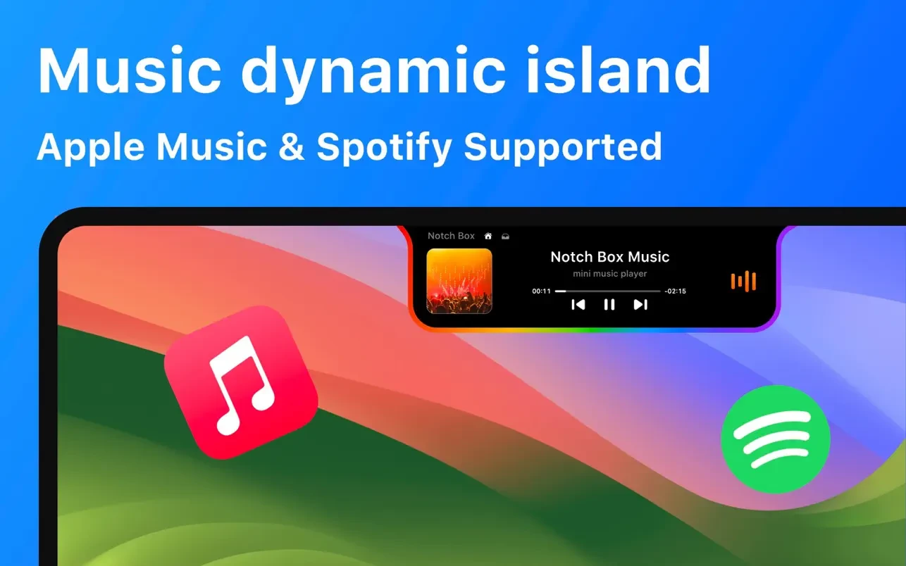 Your notch comes alive with vibrant album art and smooth animations — bouncing to the beat in sync with your music. Supports Apple Music and Spotify.