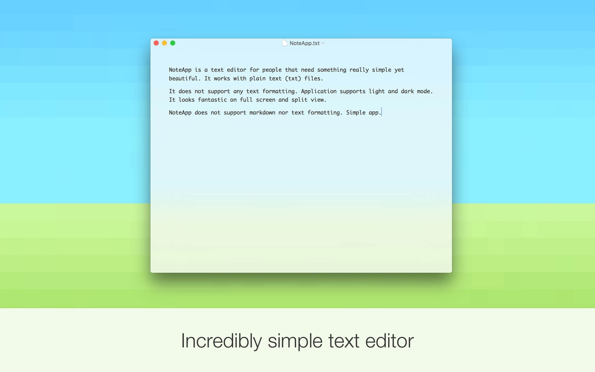 NoteApp is a text editor for people who need something really simple yet beautiful. It works with plain text (TXT) files. It does not support any text formatting. The application supports light and dark modes. It looks fantastic in full-screen and split-view modes. NoteApp does not support markdown, and we’re not going to change it. It’s an incredibly simple app.