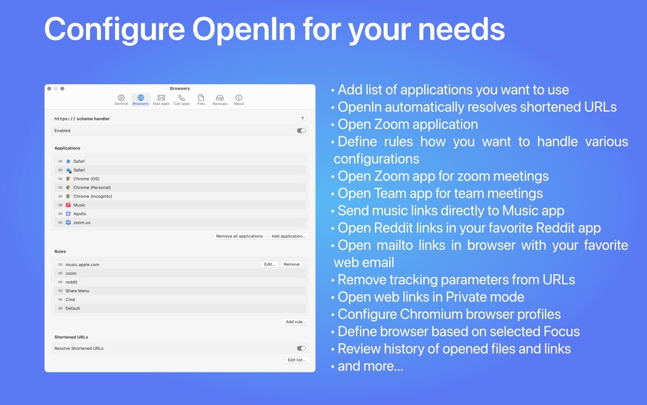 - You can always define by default to open files and links with a specific application, and configure additional rules for domains, paths, key modifiers, apps where the links were clicked, etc